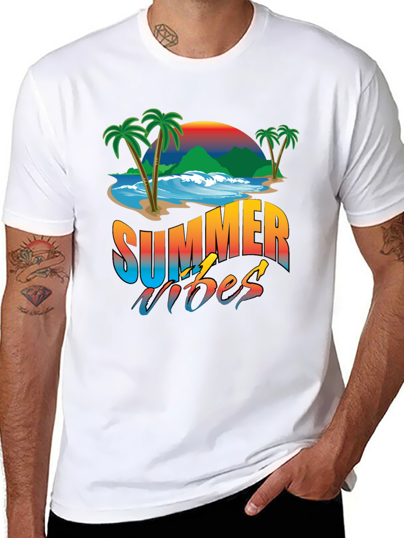 Disfruta del verano con esta camiseta negra de manga corta con un diseño vibrante y llamativo. La impresión presenta un paisaje tropical con palmeras, olas y una puesta de sol colorida, junto con la frase "Summer Vibes" en una tipografía moderna y llamativa. Perfecta para un look casual y relajado, esta camiseta es ideal para llevar en la playa, de vacaciones o simplemente para añadir un toque veraniego a tu outfit diario. El tejido parece ser suave y cómodo, perfecto para los días cálidos. ¡Prepárate para irradiar buenas vibras con esta prenda única!