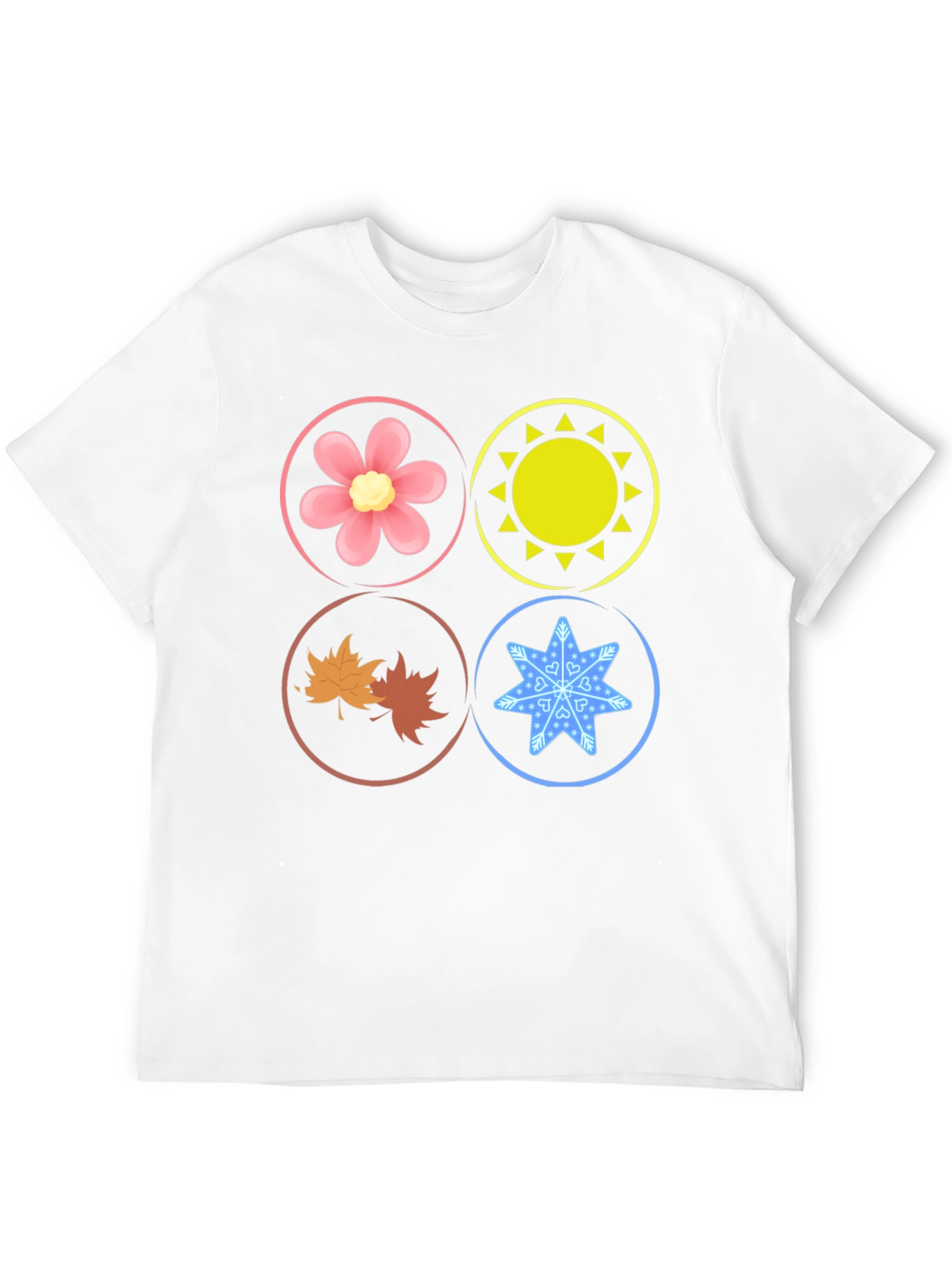 Luce esta original camiseta negra con un diseño único que celebra las cuatro estaciones del año. El estampado presenta iconos representativos de cada estación: una flor rosa para la primavera, un sol amarillo radiante para el verano, hojas otoñales marrones y naranjas, y un copo de nieve azul para el invierno. Perfecta para expresar tu amor por la naturaleza y el cambio de estaciones. Ideal para uso diario, salidas casuales o como un regalo especial para los amantes de la naturaleza y el diseño original. Su color neutro facilita la combinación con cualquier estilo.