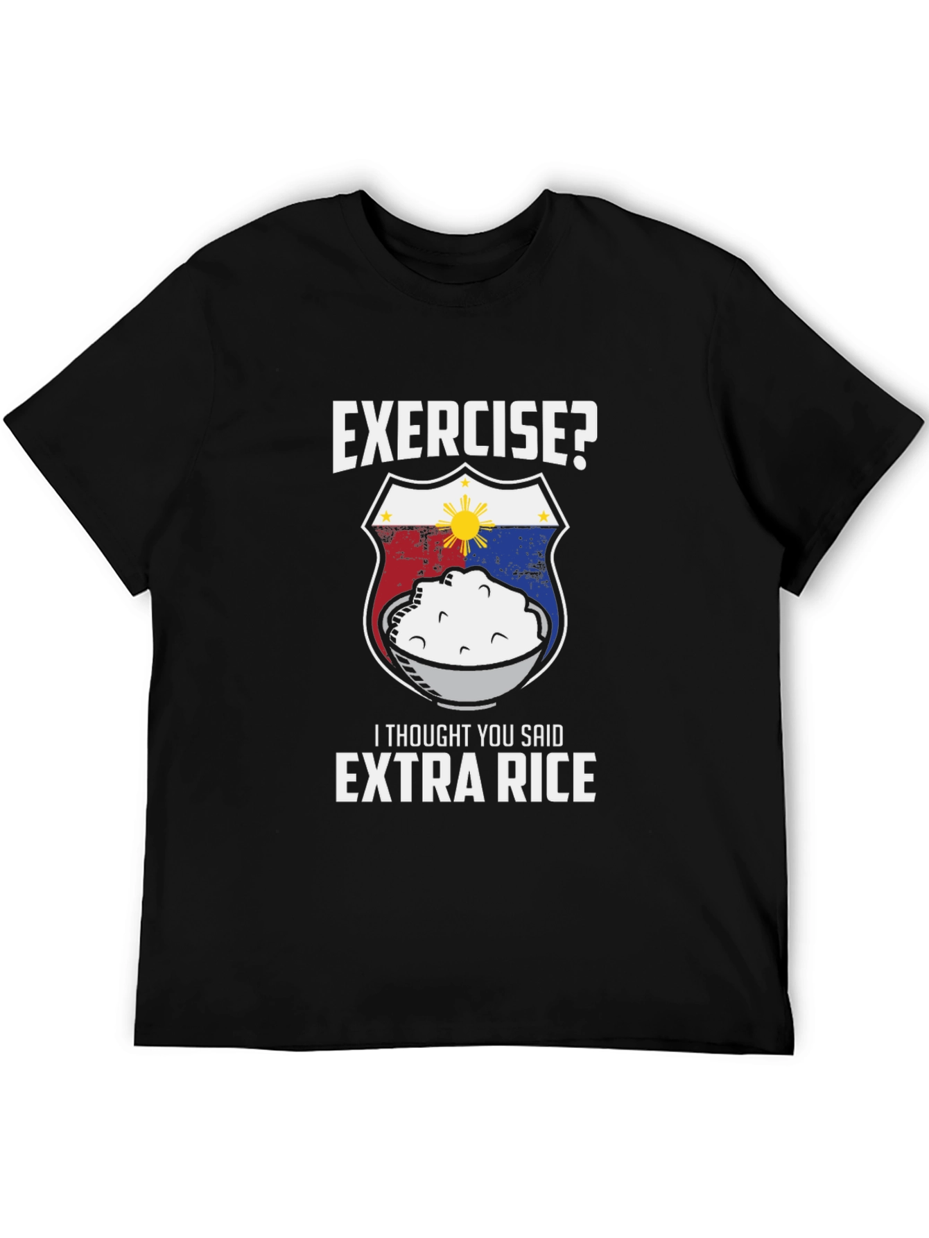 Luce esta divertida camiseta negra con un diseño único. Muestra un escudo estilizado con los colores de la bandera filipina y un sol radiante, sobre un tazón repleto de arroz. La frase "EXERCISE? I THOUGHT YOU SAID EXTRA RICE" añade un toque humorístico. Confeccionada en tela suave y cómoda, es perfecta para el uso diario, eventos casuales o para expresar tu amor por la cultura filipina y el buen comer. Ideal para aquellos que prefieren disfrutar de una buena porción de arroz antes que ir al gimnasio. ¡Una prenda que seguro dará que hablar!