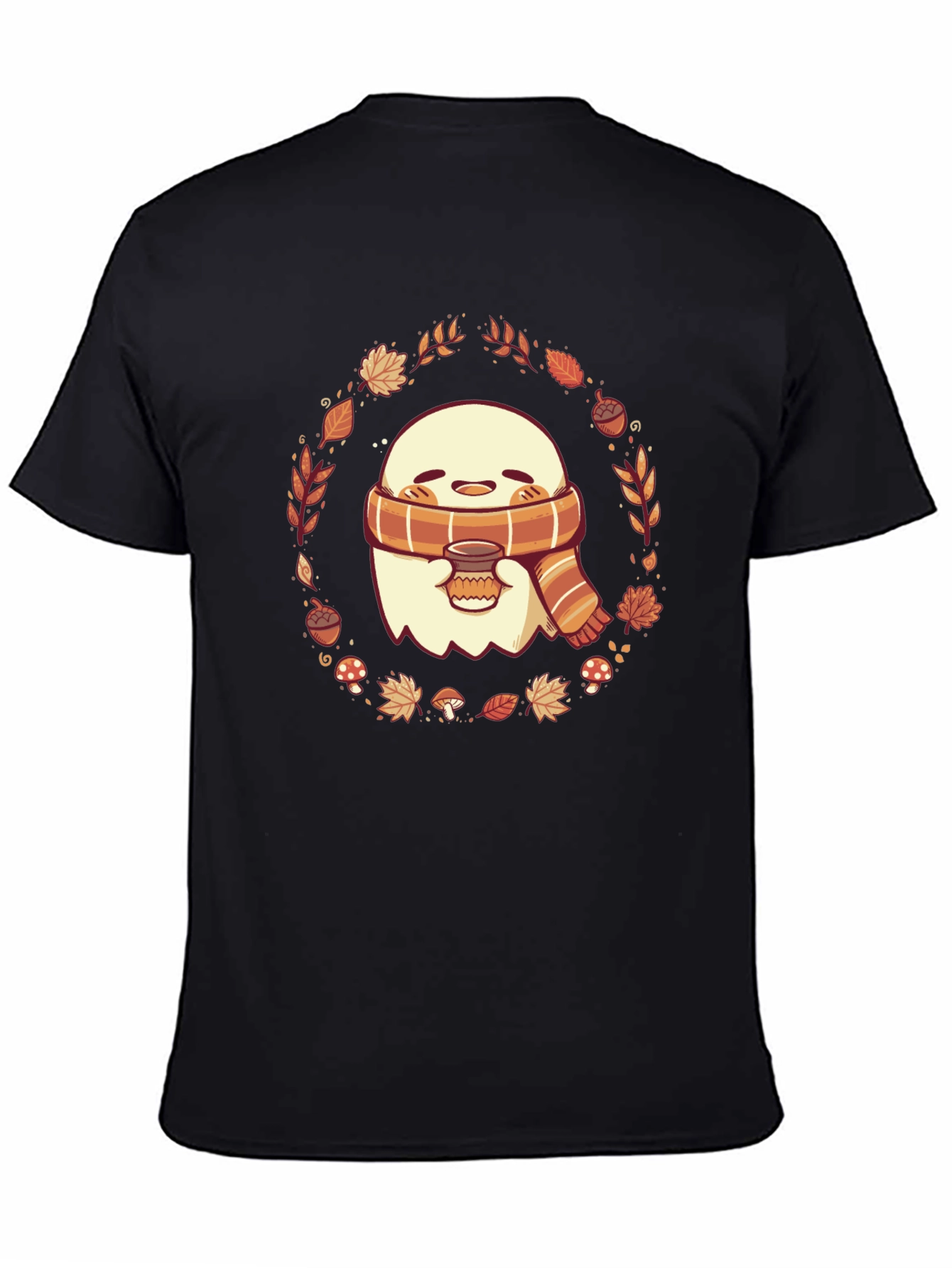 ¡Entra en el espíritu otoñal con esta encantadora camiseta negra! Presenta un adorable diseño de un fantasma blanco abrazando una taza caliente, envuelto en una bufanda a rayas color calabaza. Rodeando al fantasma hay una corona festiva de hojas de otoño, bellotas y hongos, creando un ambiente acogedor. Perfecta para los amantes del otoño, los entusiastas de Halloween o cualquiera que aprecie un diseño caprichoso. Esta camiseta es ideal para usarla en capas durante los paseos otoñales, noches de cine acogedoras o como una declaración de moda divertida en cualquier día. Añade un toque de encanto de temporada a tu armario con esta camiseta única.