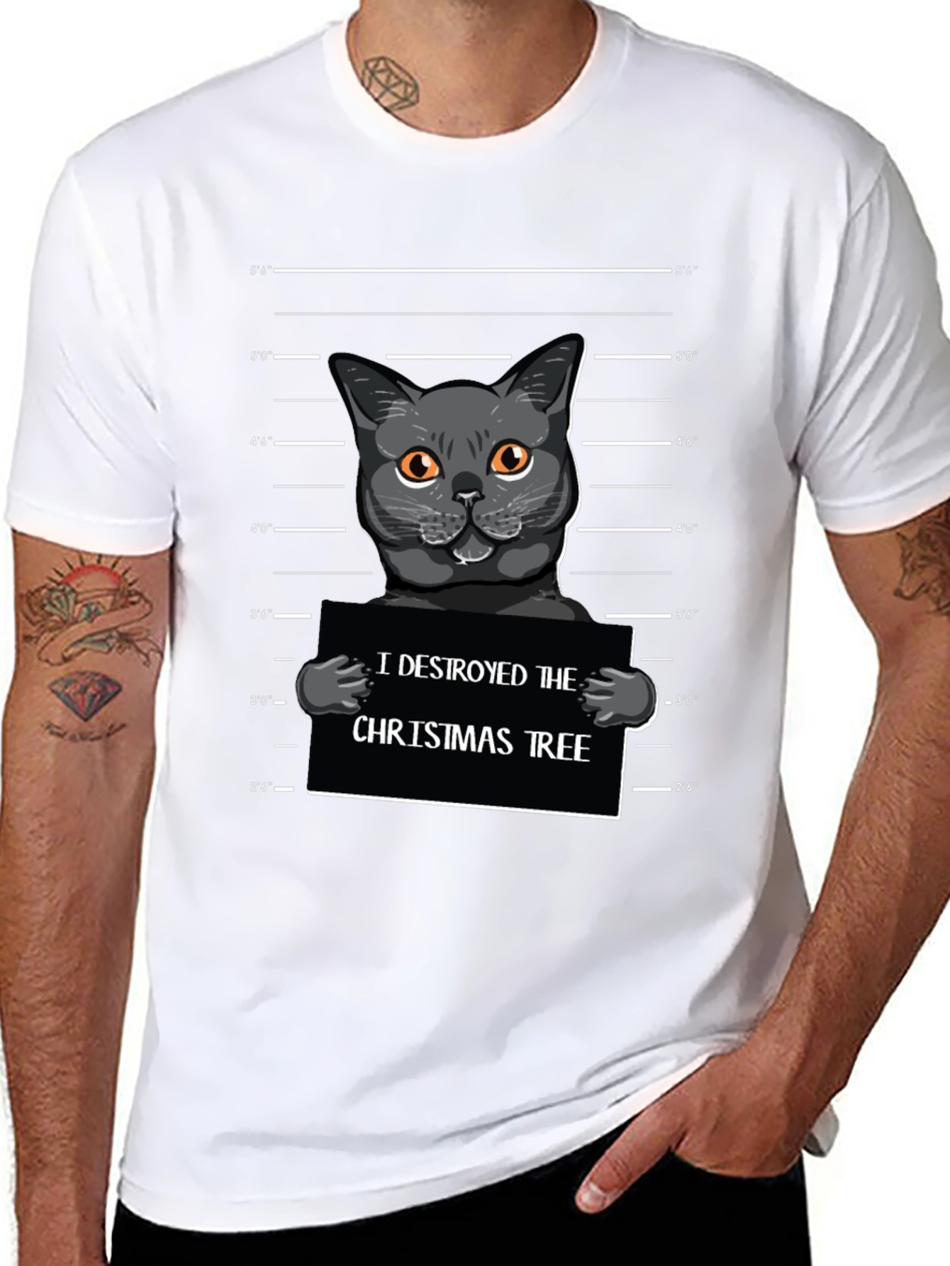Esta camiseta negra presenta un diseño divertido y original. Muestra un gato gris con ojos anaranjados en una pose de "foto policial", sosteniendo un cartel que dice "I DESTROYED THE CHRISTMAS TREE" (Yo destruí el árbol de Navidad). Ideal para los amantes de los gatos con sentido del humor, especialmente durante la temporada navideña. Perfecta para usar en reuniones informales, fiestas o simplemente para expresar tu personalidad. La impresión de alta calidad garantiza que el diseño se mantenga vibrante lavado tras lavado. Una excelente adición a tu guardarropa o un regalo único y divertido para un amigo o familiar.