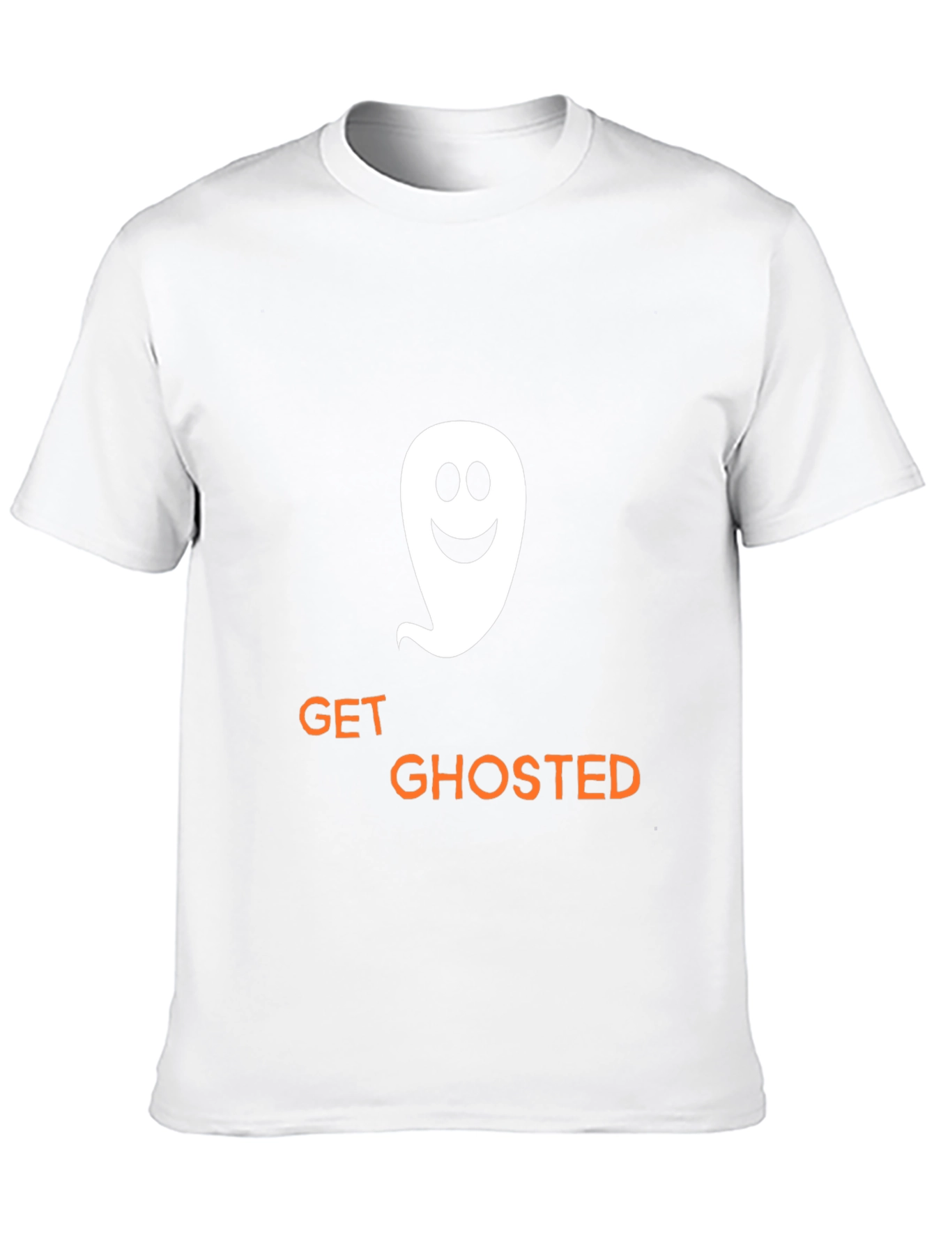 Luce un estilo divertido y misterioso con esta camiseta negra de manga corta. El diseño presenta un simpático fantasma blanco sonriente en el centro, acompañado del texto naranja "GET GHOSTED", creando un look llamativo y moderno. Perfecta para Halloween, fiestas temáticas, o simplemente para expresar tu sentido del humor único. El tejido parece ser de algodón suave, lo que garantiza comodidad durante todo el día. Combínala con tus jeans favoritos o pantalones casuales para un outfit relajado pero con estilo. ¡Prepárate para ser el centro de atención con esta original camiseta!