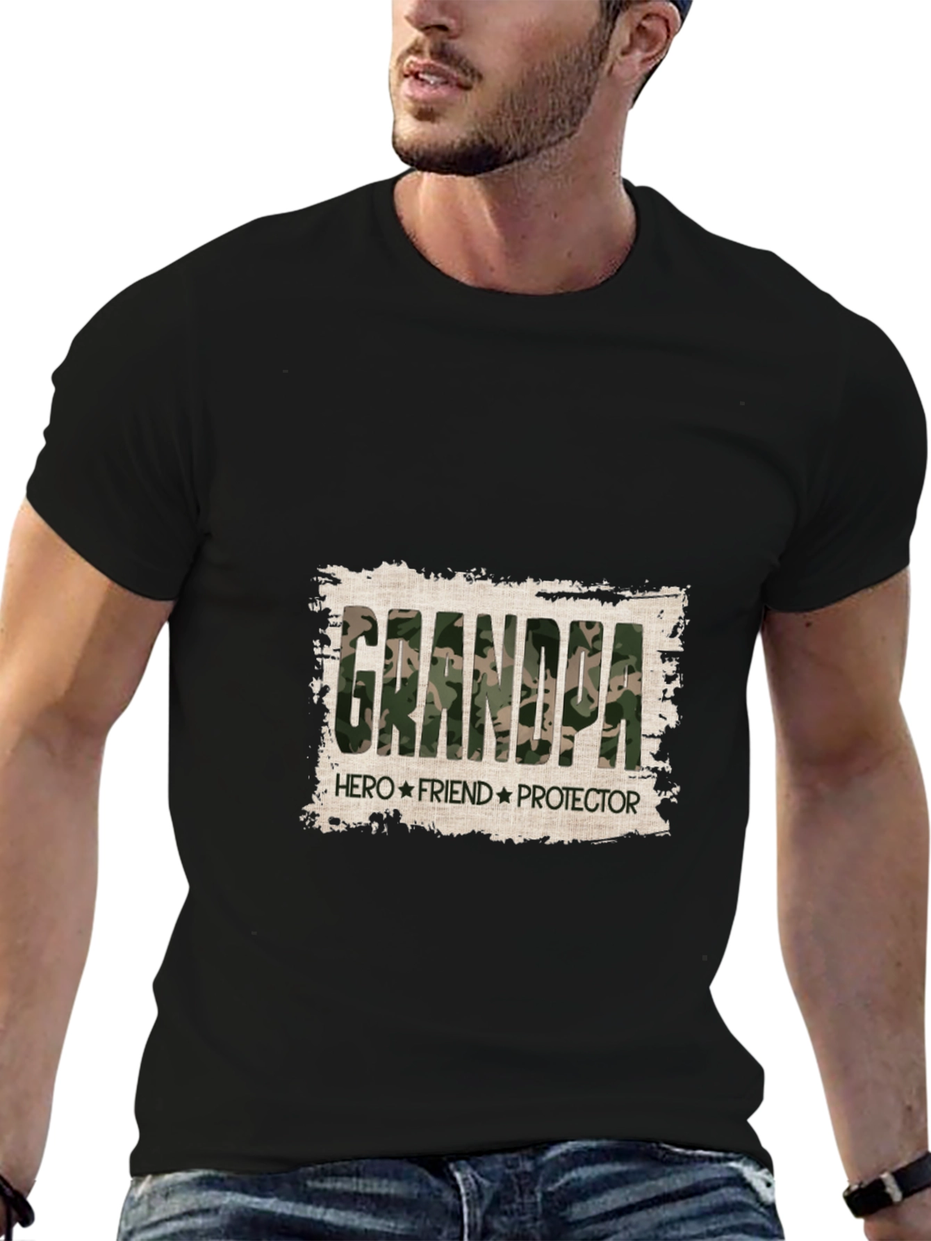 Luce con orgullo esta camiseta negra con un diseño especial para los abuelos. La camiseta presenta la palabra "GRANDPA" con un estampado de camuflaje militar, enmarcada en un rectángulo estilo vintage. Debajo, se lee "HERO FRIEND PROTECTOR" entre estrellas. Perfecta para demostrar admiración por el abuelo en cualquier ocasión, desde reuniones familiares hasta salidas casuales. Fabricada en un tejido cómodo y duradero, esta camiseta es un regalo ideal para el día del padre, cumpleaños o simplemente para expresar cariño y agradecimiento a ese héroe familiar. Un diseño único y emotivo que sin duda llamará la atención.