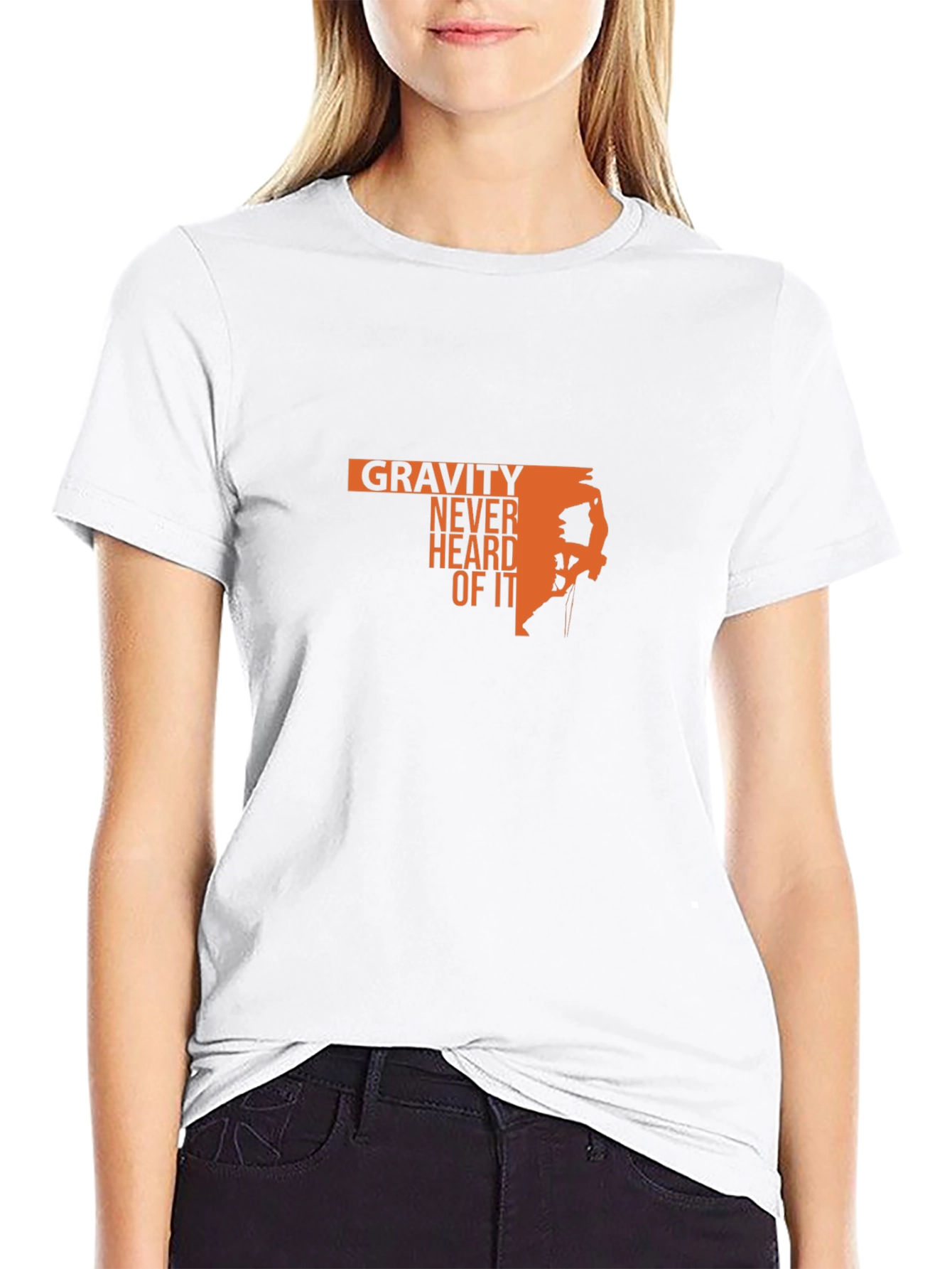 Luce tu pasión por la escalada con esta llamativa camiseta negra. Presenta un diseño gráfico en color naranja con la frase 'Gravity Never Heard Of It' y la silueta de un escalador. Fabricada con un tejido suave y cómodo, esta camiseta es perfecta para el uso diario o para destacar en el gimnasio de escalada. Su diseño único la convierte en una excelente opción para los amantes de la aventura y los deportes extremos. Ideal para combinar con vaqueros, pantalones deportivos o cualquier atuendo casual. ¡Muestra tu espíritu aventurero con esta original camiseta!