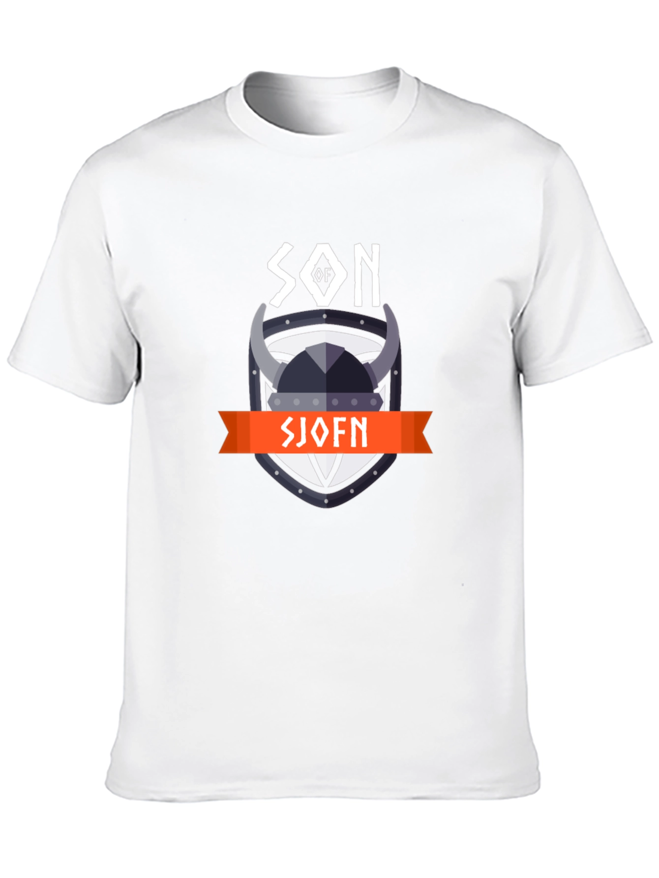Luce esta llamativa camiseta negra con un diseño único. Destaca un escudo vikingo estilizado con cuernos, acompañado del texto "SON OF", y una franja naranja con la palabra "SJOFN". Perfecta para los amantes de la cultura vikinga y la mitología nórdica. Ideal para uso casual, eventos temáticos o como un regalo original. Fabricada con materiales cómodos y duraderos. Añade un toque guerrero a tu estilo con esta prenda distintiva.