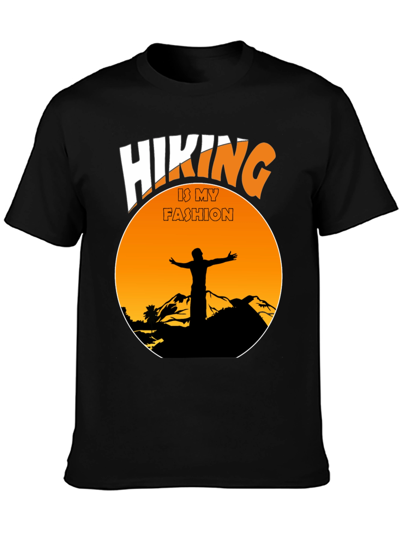 Luce esta camiseta negra de manga corta con un diseño vibrante y llamativo. Presenta un círculo naranja con una silueta negra de una persona disfrutando de una puesta de sol en la montaña. El texto "Hiking is My Fashion" destaca en blanco y naranja, dándole un toque divertido y aventurero. Perfecta para los amantes del senderismo y la naturaleza que quieren expresar su pasión con estilo. Hecha con materiales cómodos y de alta calidad, esta camiseta es ideal para usar en tus aventuras al aire libre o para un look casual y relajado en el día a día. ¡Una declaración de moda para espíritus libres!