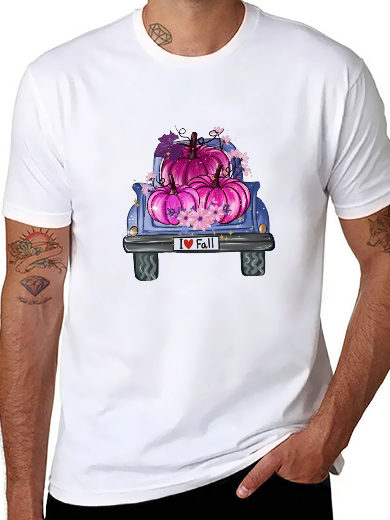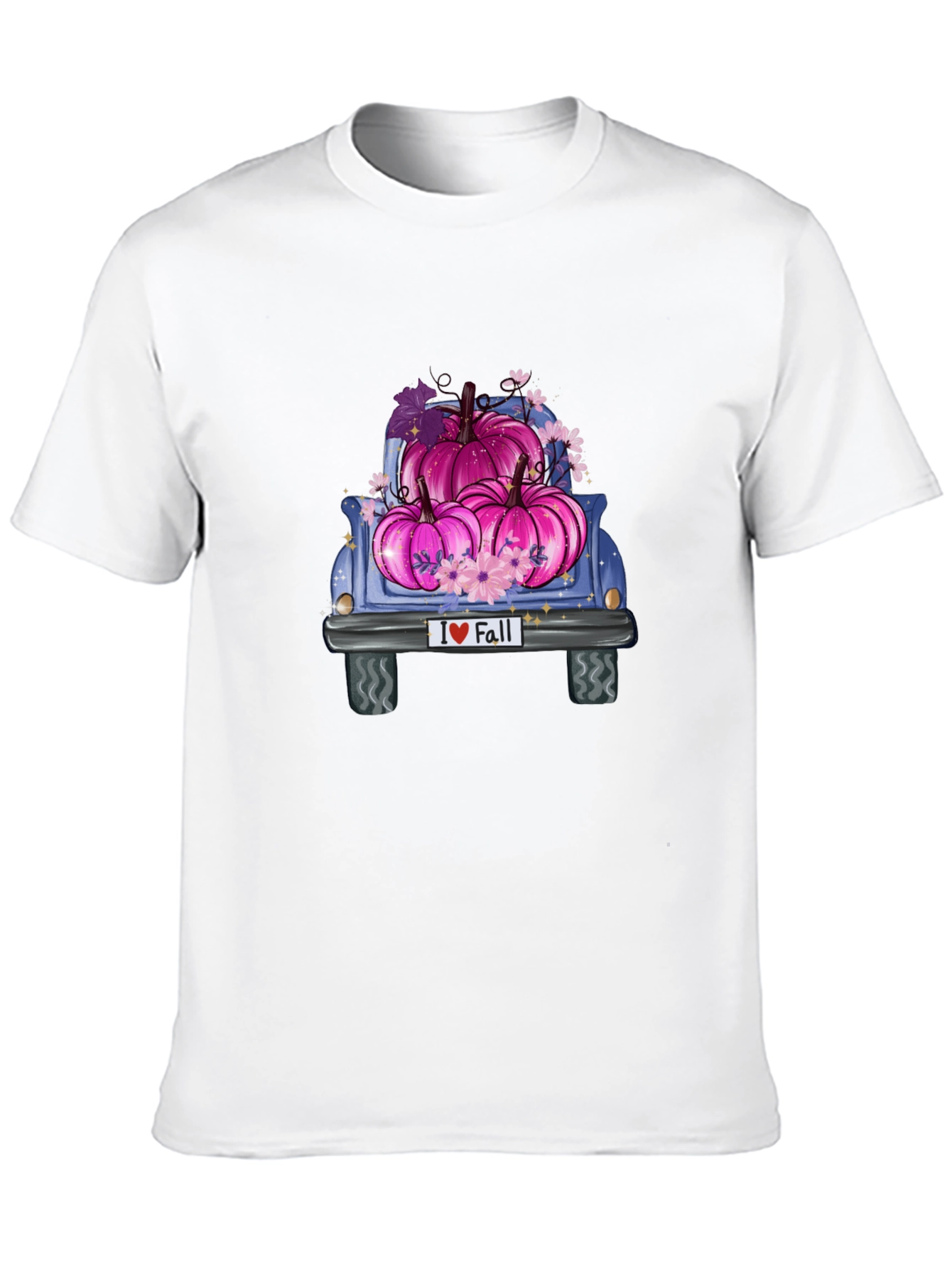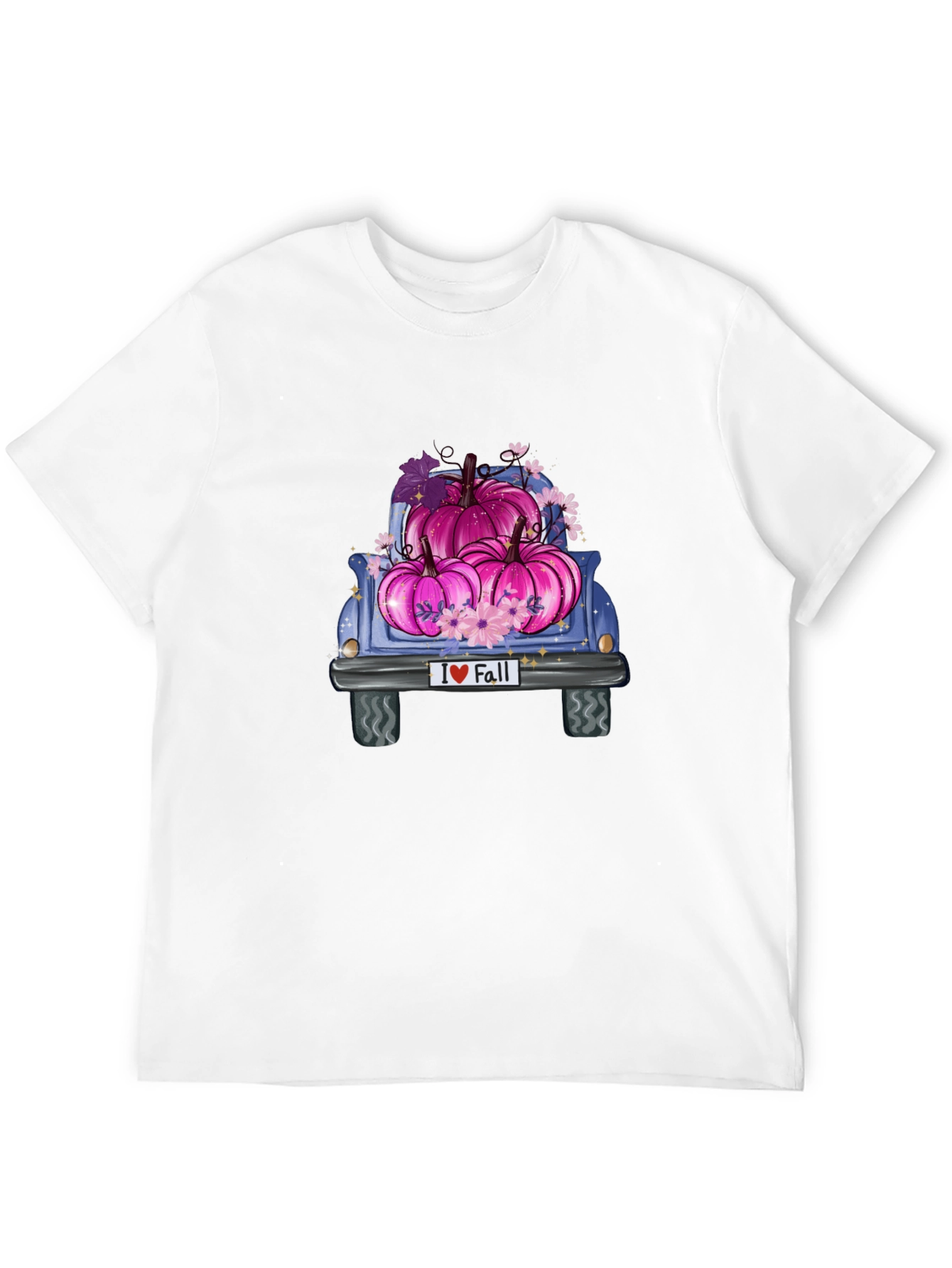 Celebra la temporada de otoño con esta encantadora camiseta negra. Presenta un diseño único de un camión vintage azul lleno de calabazas rosadas y flores delicadas. El detalle "I ❤️ Fall" en la placa del camión añade un toque festivo. Perfecta para lucir un estilo casual y alegre en cualquier ocasión otoñal. Fabricada con materiales suaves y cómodos, esta camiseta es ideal para combinar con jeans, leggings o faldas. Demuestra tu amor por el otoño con esta prenda original y llamativa. ¡Una adición imprescindible para tu guardarropa de temporada!