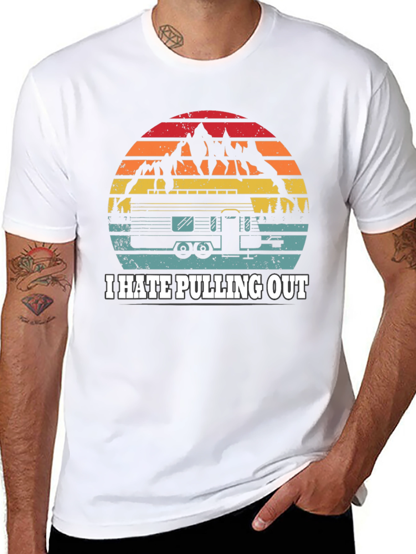 Luce esta llamativa camiseta negra con un diseño retro de camping. El estampado circular presenta montañas, árboles y una caravana, todo dentro de un degradado de colores anaranjados y azules. La frase "I HATE PULLING OUT" añade un toque humorístico. Ideal para los amantes de la naturaleza y las aventuras al aire libre, esta camiseta es perfecta para llevar en tus excursiones de camping o para un look casual con un toque divertido. Fabricada con materiales cómodos, esta camiseta es ideal para cualquier ocasión informal. ¡Muestra tu espíritu aventurero con esta prenda única!