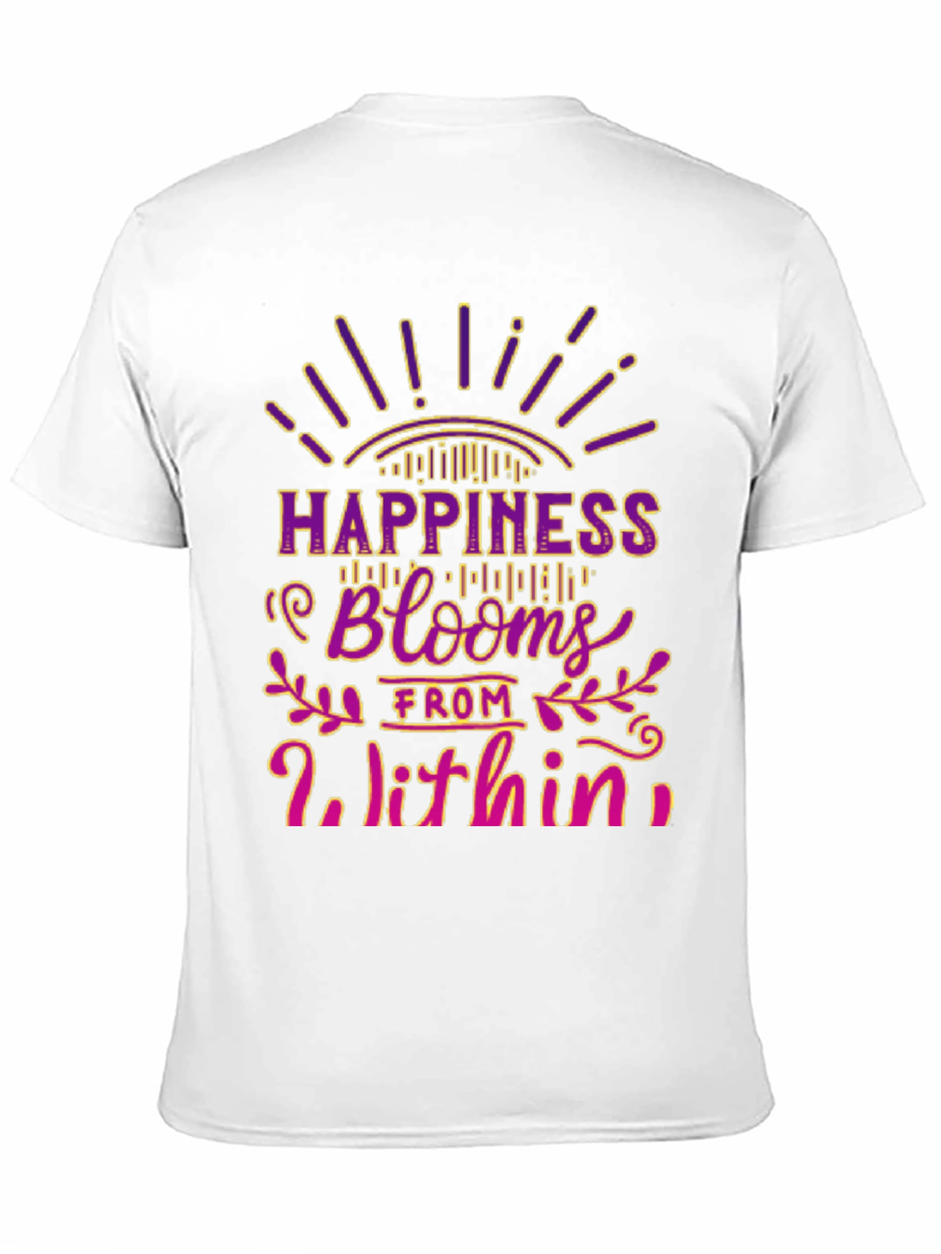 Esta camiseta negra presenta un diseño llamativo con la frase "La Felicidad Florece Desde Dentro". La inscripción está adornada con colores vibrantes como el púrpura y el rosa, creando un efecto visual alegre y motivador. Los detalles gráficos, como los rayos de sol y los adornos florales, añaden un toque artístico y original. Ideal para llevar en el día a día, esta camiseta no solo te hará sentir cómodo, sino que también transmitirá un mensaje positivo a quienes te rodean. Perfecta para combinar con jeans, faldas o pantalones cortos, esta prenda es una excelente adición a cualquier guardarropa informal. Un regalo ideal para aquellos que valoran la positividad y el estilo único.
