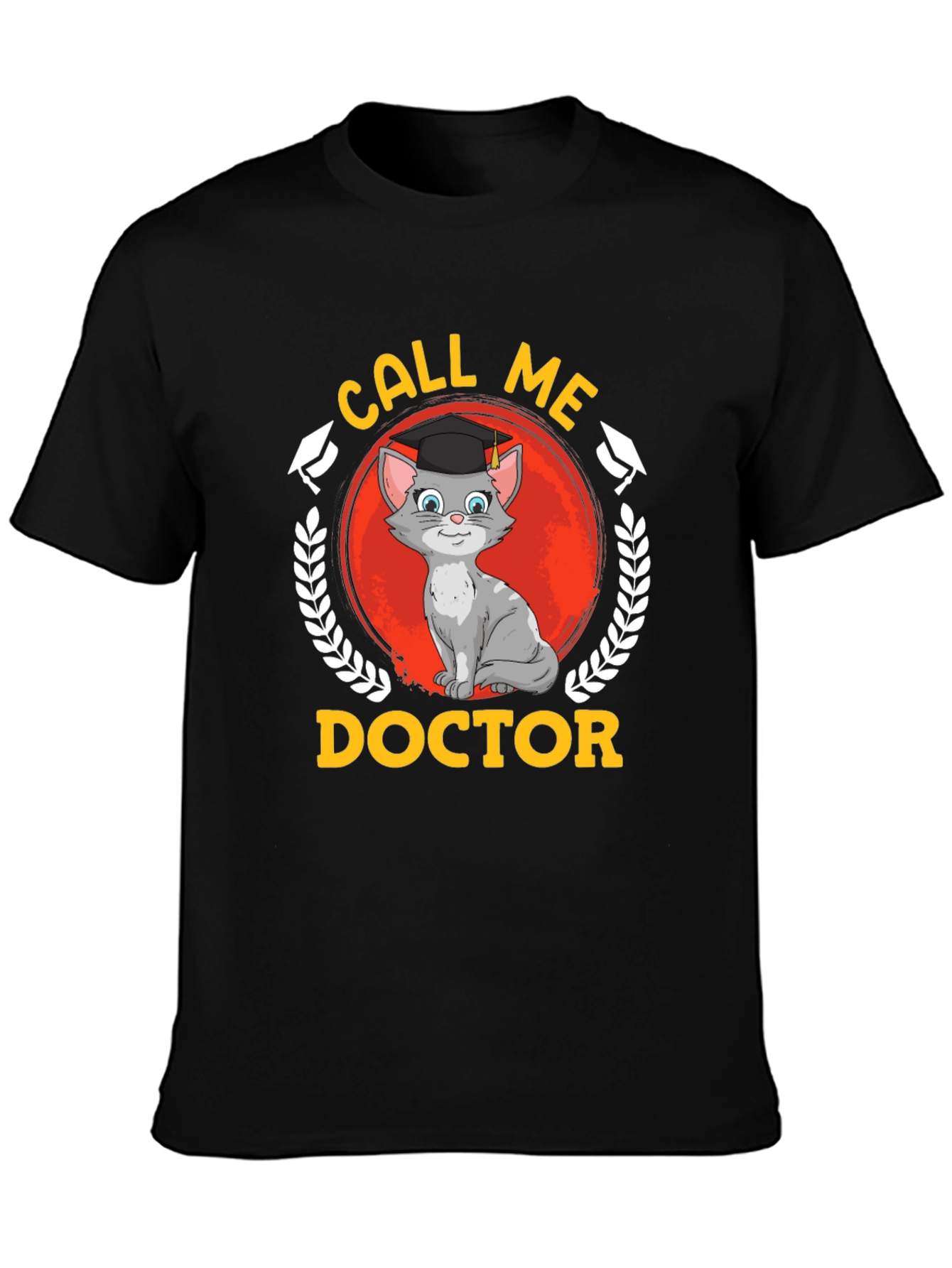 Esta camiseta negra de manga corta presenta un divertido y original diseño. En el centro, se muestra un adorable gato gris con un birrete de graduación, dentro de un círculo rojo rodeado de laureles. El texto "CALL ME" y "DOCTOR" están dispuestos de forma circular alrededor de la imagen del gato, añadiendo un toque humorístico y académico. Confeccionada con materiales suaves y cómodos, esta camiseta es perfecta para lucir un estilo casual y a la vez celebrar un logro académico. Ideal para graduados, estudiantes o amantes de los gatos con sentido del humor. ¡Un regalo perfecto para aquellos que han alcanzado sus metas!