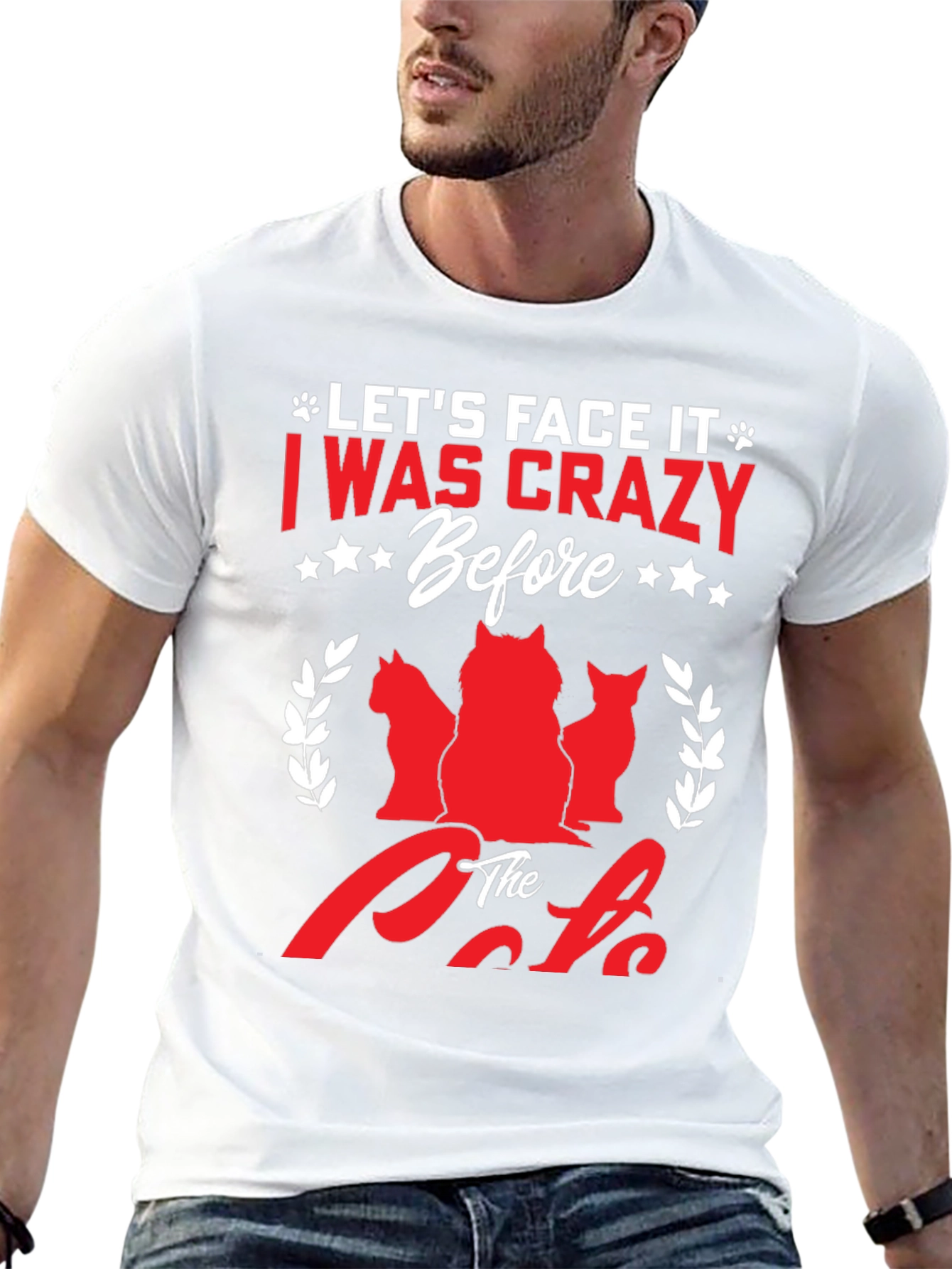 Esta camiseta negra de manga corta presenta un diseño divertido para los amantes de los gatos. La frase "Let's face it I was crazy before the cats" (Aceptémoslo, estaba loco antes de los gatos) está impresa en llamativo color rojo y blanco, junto con ilustraciones de siluetas de gatos y elementos decorativos. Fabricada en un material suave y cómodo, esta camiseta es perfecta para lucir tu pasión por los felinos con estilo y humor. Ideal para uso diario, reuniones informales o como un regalo original para un amigo o familiar que adore los gatos. ¡Demuestra tu amor gatuno con esta prenda única!