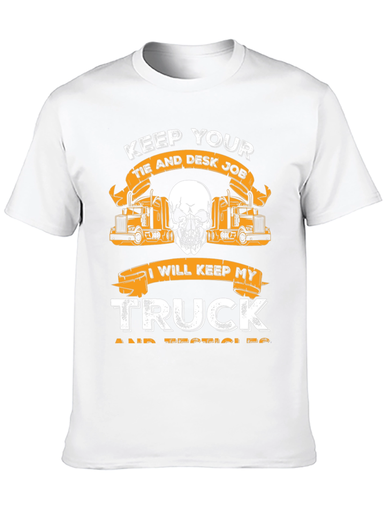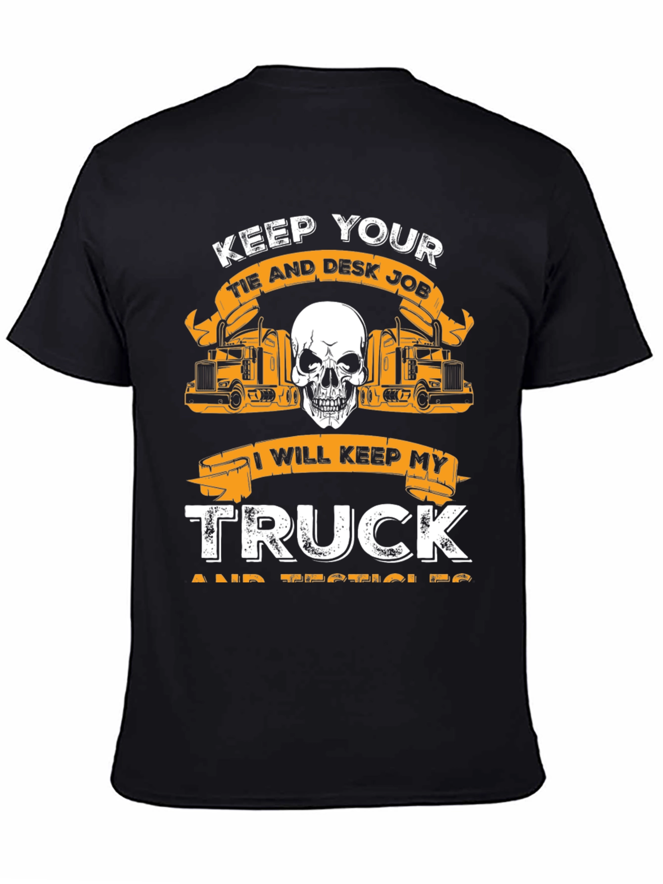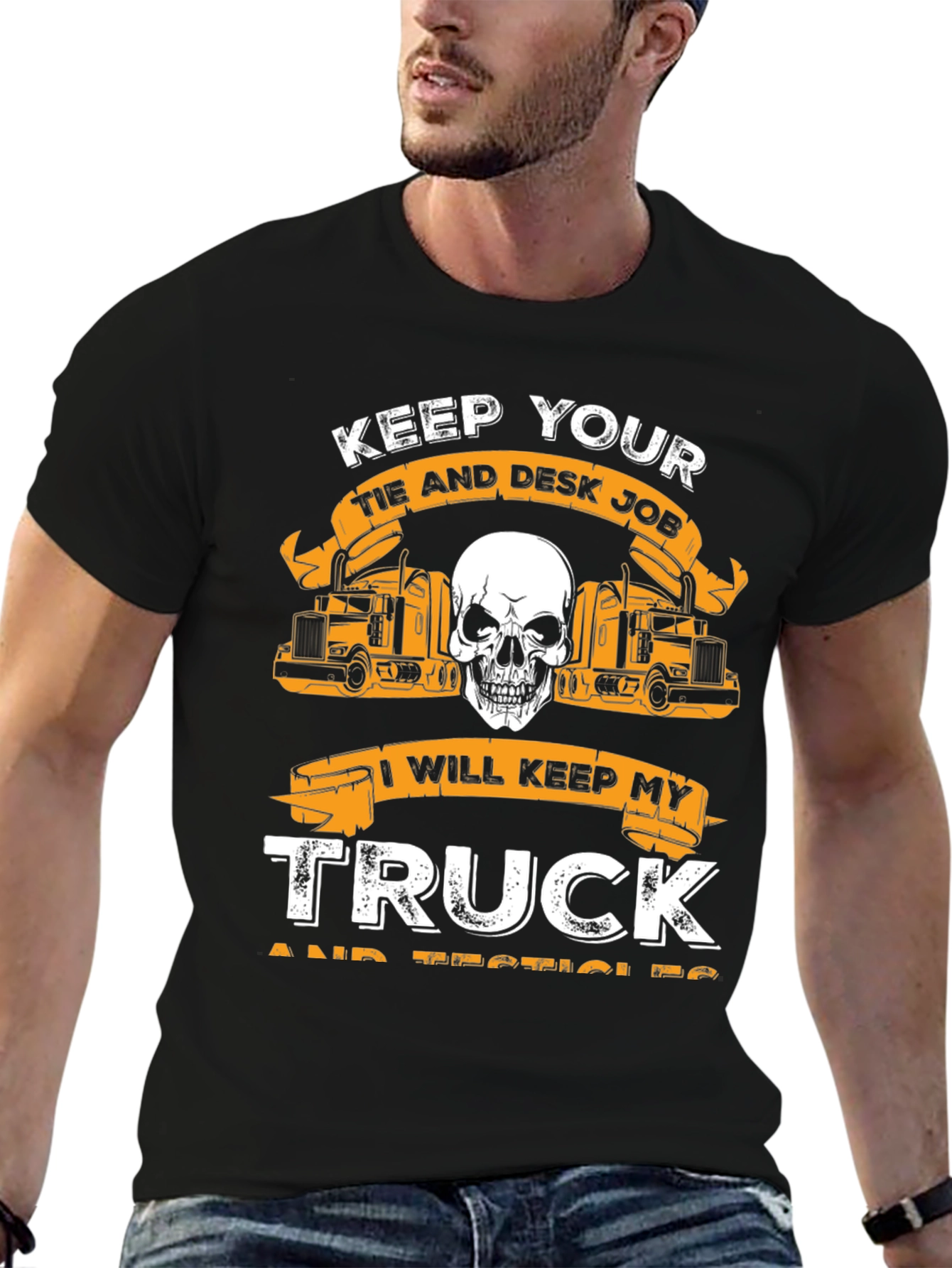 Luce esta camiseta negra de manga corta con un diseño audaz y llamativo. En el centro, destaca un gráfico con un cráneo rodeado de camiones y una tipografía llamativa en tonos blanco y naranja. El diseño proclama con orgullo: "Keep your tie and desk job, I will keep my truck... and Testicles". Confeccionada en un material que parece ser suave y cómodo, esta camiseta es perfecta para el uso diario. El diseño expresa una actitud rebelde y desafiante, ideal para moteros, camioneros o cualquier persona con un espíritu libre. Llévala en tu próximo viaje en moto, en un encuentro con amigos o simplemente para expresar tu personalidad única. Muestra tu pasión por la carretera y tu individualidad con esta prenda única y llamativa.
