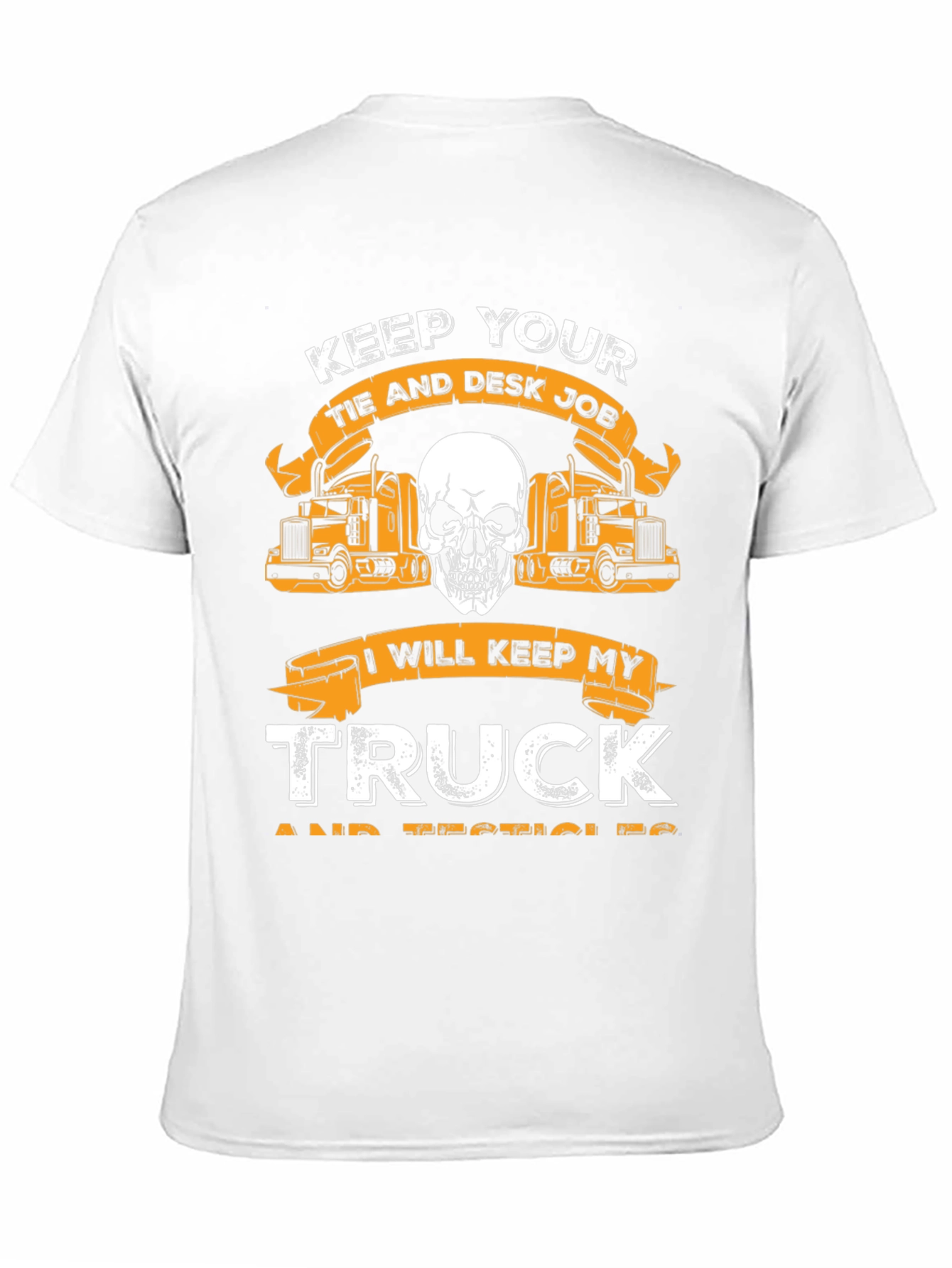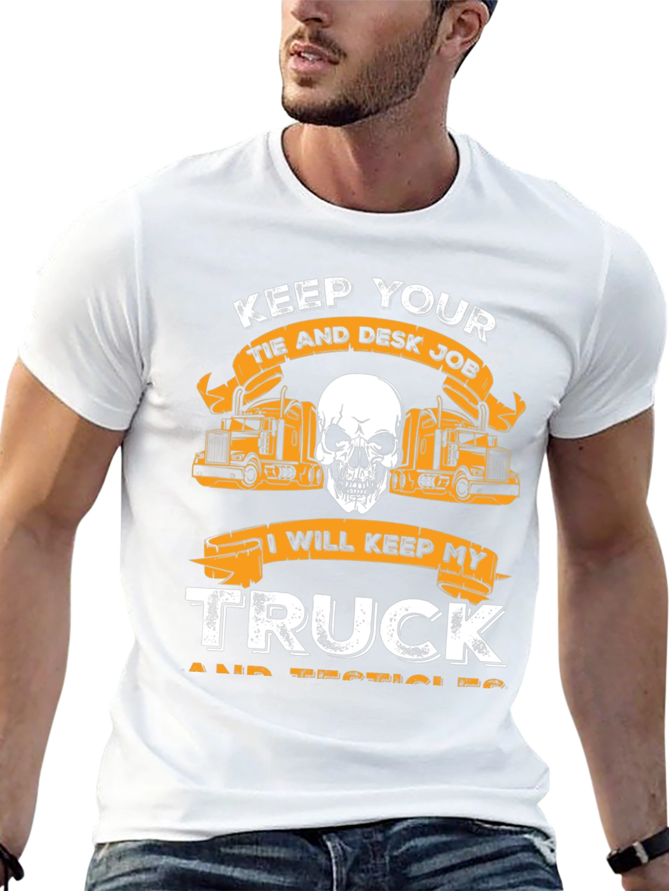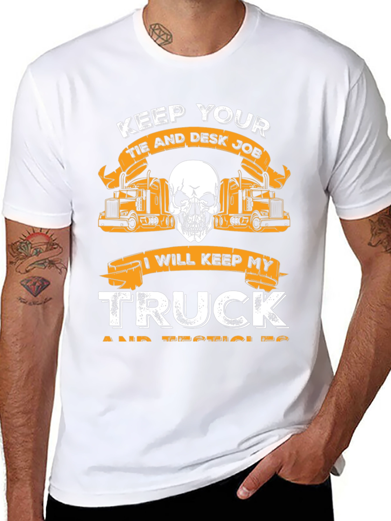 Luce esta camiseta negra de manga corta con un diseño audaz y llamativo. En el centro, destaca un gráfico con un cráneo rodeado de camiones y una tipografía llamativa en tonos blanco y naranja. El diseño proclama con orgullo: "Keep your tie and desk job, I will keep my truck... and Testicles". Confeccionada en un material que parece ser suave y cómodo, esta camiseta es perfecta para el uso diario. El diseño expresa una actitud rebelde y desafiante, ideal para moteros, camioneros o cualquier persona con un espíritu libre. Llévala en tu próximo viaje en moto, en un encuentro con amigos o simplemente para expresar tu personalidad única. Muestra tu pasión por la carretera y tu individualidad con esta prenda única y llamativa.