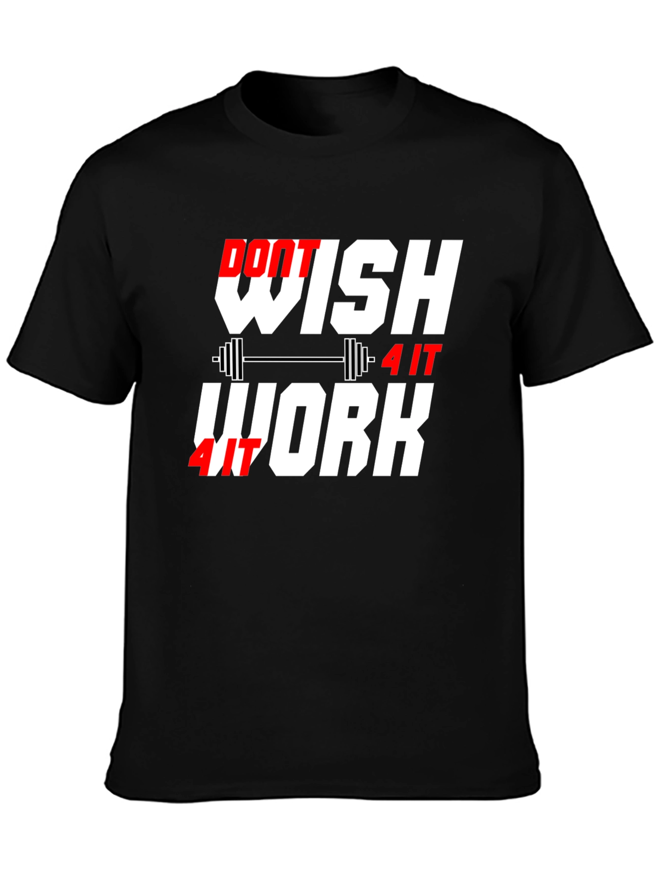 Esta camiseta negra presenta un diseño motivacional audaz. En el centro, se puede leer la frase "Don't Wish 4 It, Work 4 It", combinando letras blancas con detalles en rojo para un impacto visual llamativo. Un gráfico de barra con pesas atraviesa la frase, reforzando el tema de esfuerzo y entrenamiento. Hecha de un material suave al tacto, ideal para el uso diario o para entrenar en el gimnasio. Su corte clásico ofrece comodidad y libertad de movimiento. Perfecta para aquellos que buscan inspiración en su vestimenta y quieren reflejar una actitud positiva y de dedicación. Una prenda ideal para deportistas, entrenadores y personas que persiguen sus metas con determinación.