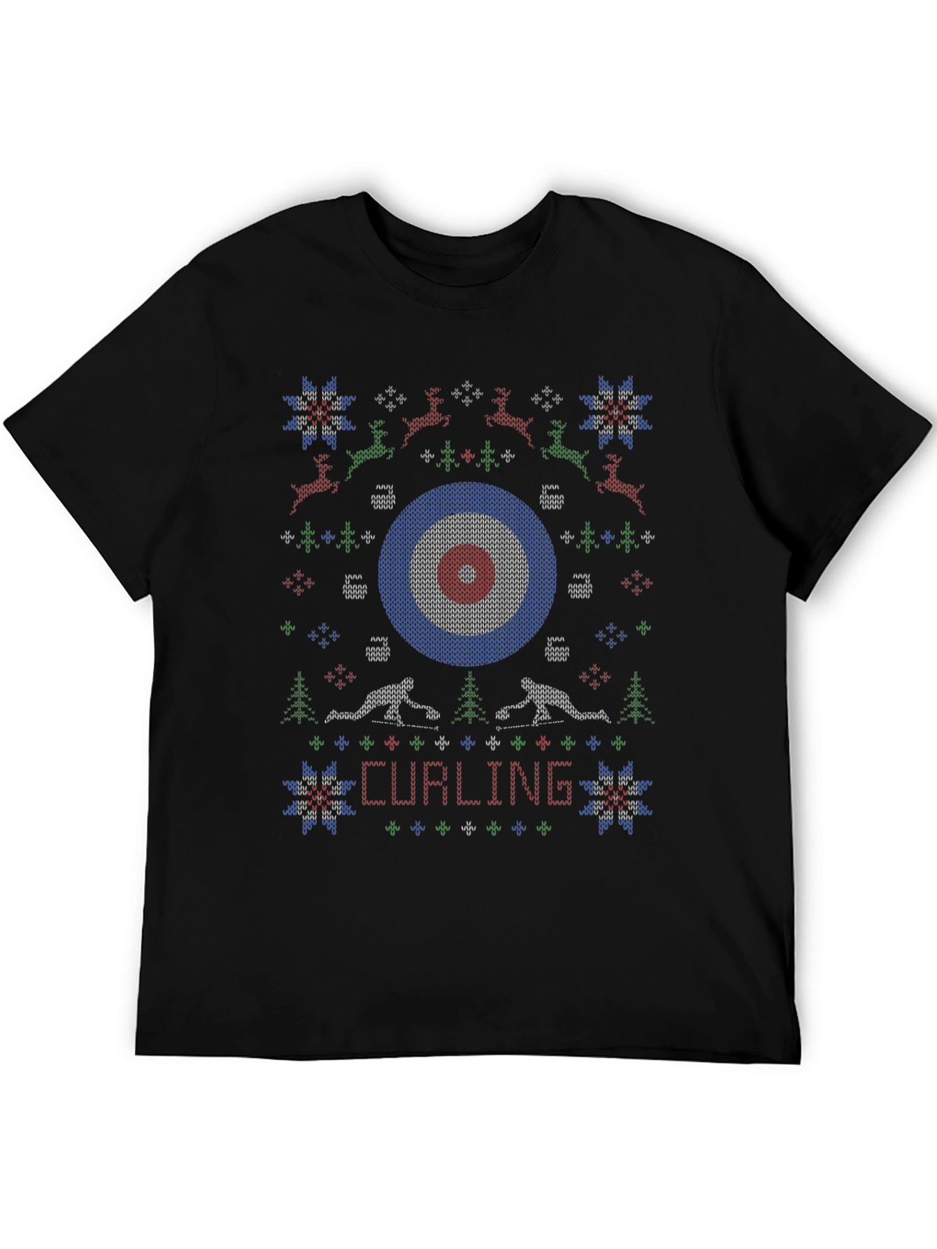 Celebra la temporada navideña con esta divertida camiseta negra. Presenta un diseño único de "ugly sweater" con elementos temáticos de curling, incluyendo piedras, jugadores, y la palabra "CURling". El motivo navideño se complementa con renos y copos de nieve estilo bordado. Perfecta para los fanáticos del curling que quieren mostrar su espíritu festivo de una manera original y llamativa. Ideal para usar en fiestas navideñas, eventos deportivos o simplemente para agregar un toque de humor a tu vestuario diario. Confortable y lista para destacar.