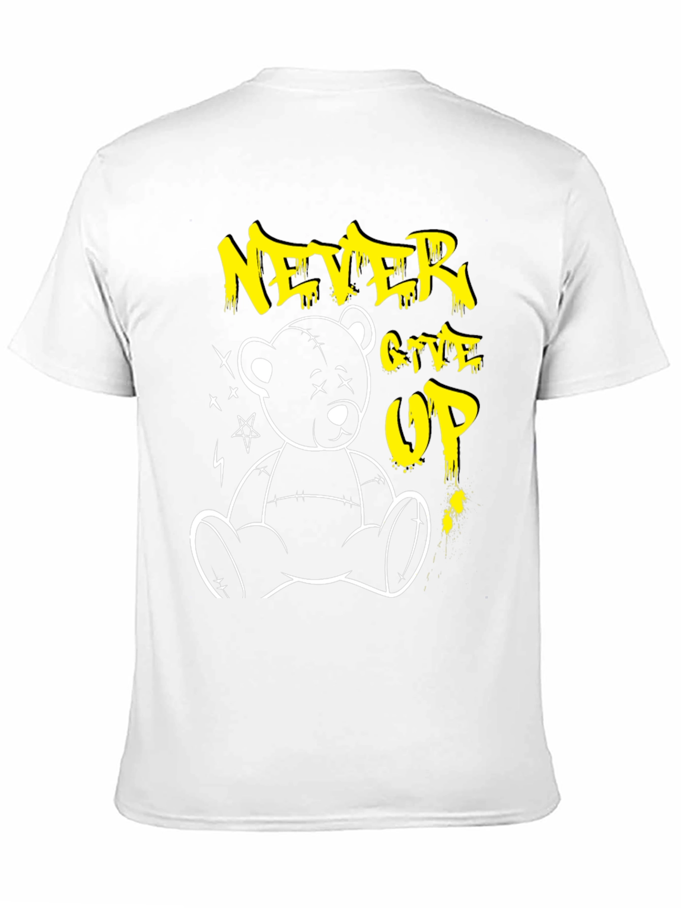 Luce esta moderna camiseta negra con un diseño llamativo. Presenta un tierno oso de peluche en blanco contrastando sobre el fondo oscuro. Sobre el oso, la frase inspiradora "Never Give Up" destaca en un color amarillo vibrante. El diseño incluye también detalles gráficos como estrellas y efectos de pintura que le dan un toque urbano y moderno. Perfecta para un look casual y relajado, esta camiseta es ideal para expresar tu actitud positiva y determinación. Confeccionada en un material suave y cómodo, es perfecta para el uso diario. Ideal para combinar con jeans, shorts o faldas. ¡Muestra tu espíritu imparable con esta camiseta única!