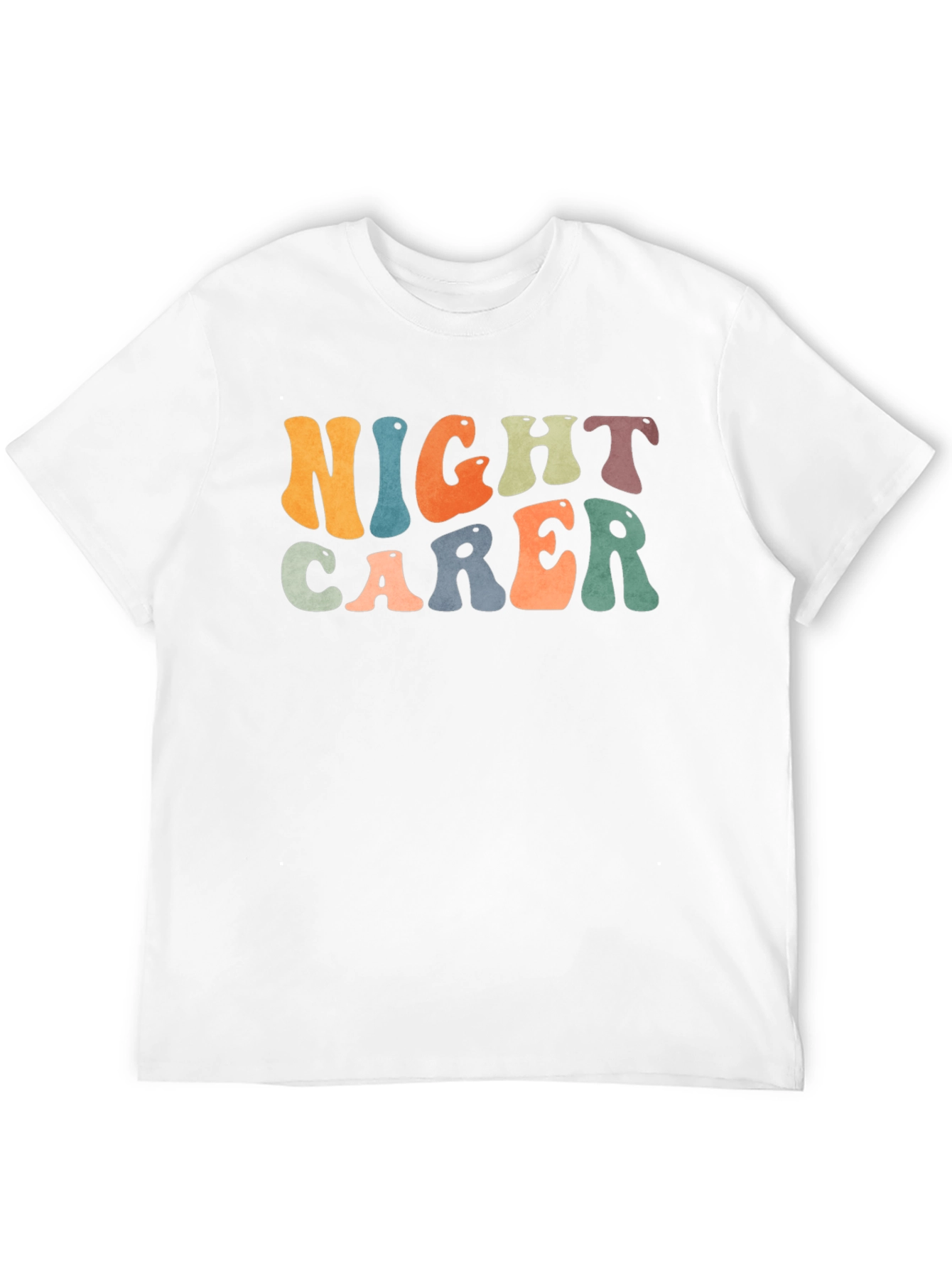 Luce esta llamativa camiseta negra con un estampado retro que dice 'Night Carer' en alegres colores pastel y naranja. El diseño de letras gruesas y onduladas le da un toque vintage y divertido. Confeccionada en un tejido suave y cómodo, esta camiseta de manga corta es perfecta para usar en el día a día o para expresar tu sentido del humor. Ideal para profesionales del cuidado nocturno o para cualquier persona que aprecie un estilo retro y original. Combínala con jeans, pantalones cortos o faldas para un look casual y lleno de personalidad. Una prenda imprescindible para tu guardarropa.