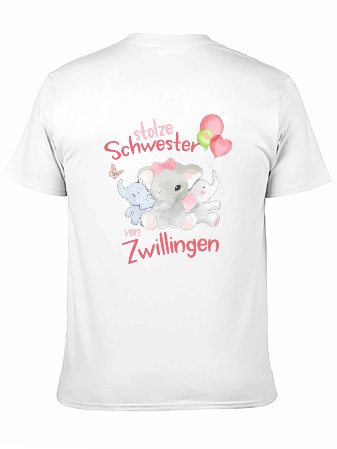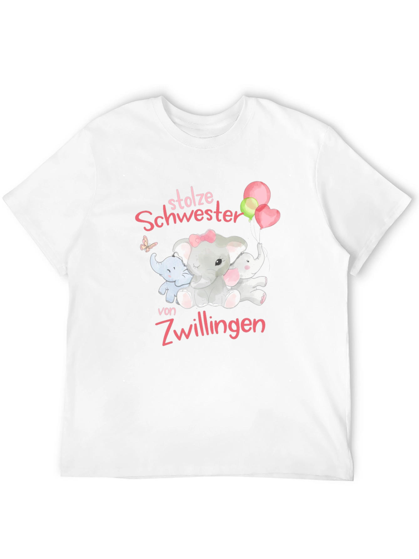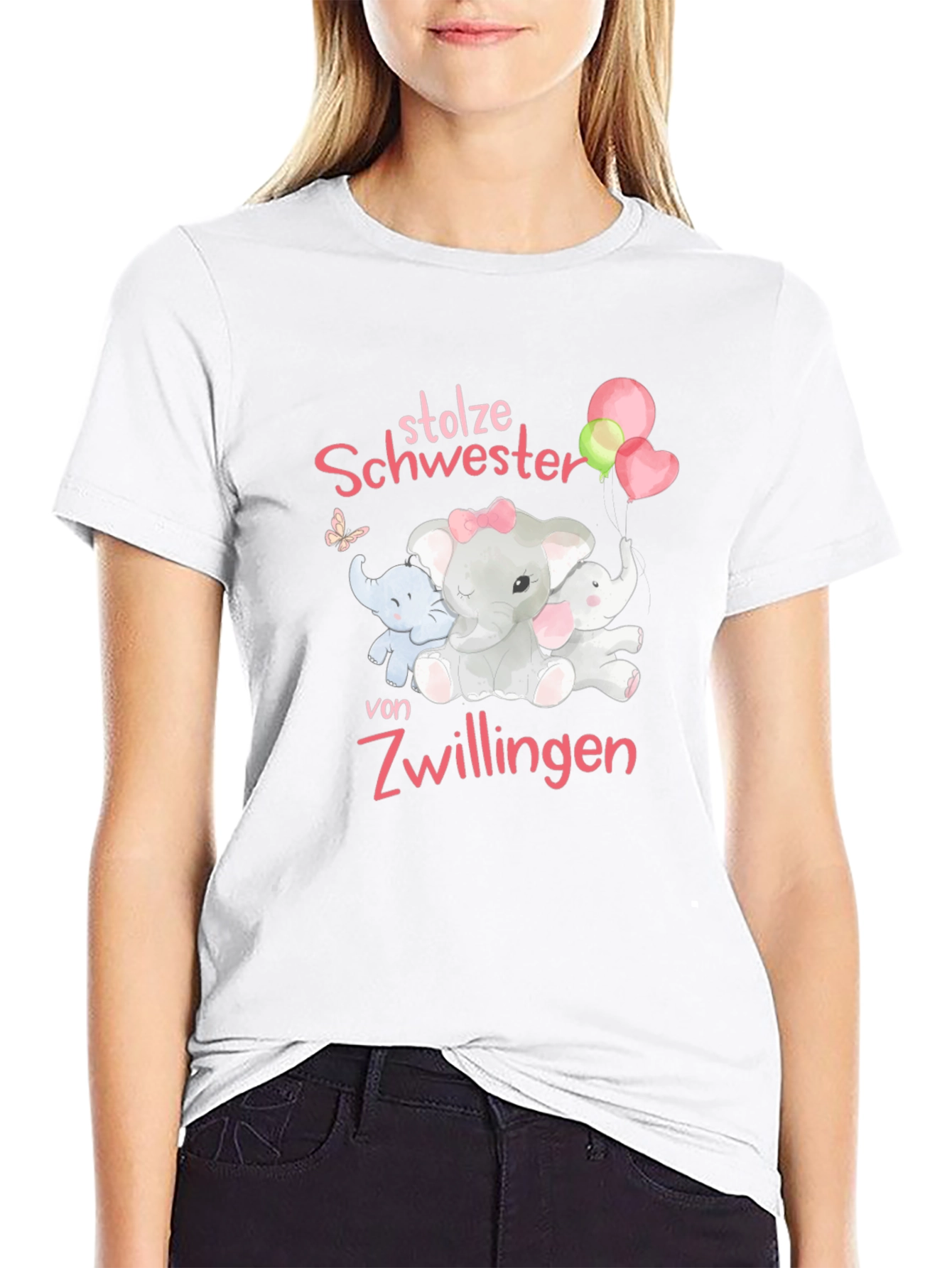 Esta camiseta negra presenta un adorable diseño con elefantes y globos. La frase "stolze Schwester von Zwillingen" (orgullosa hermana de gemelos) está impresa en color rosa. Perfecta para celebrar el nacimiento de gemelos y mostrar el orgullo de ser su hermana mayor. Ideal para usar en fiestas de cumpleaños, reuniones familiares o simplemente para el día a día. El diseño encantador y la suavidad del tejido aseguran comodidad y estilo. Un regalo perfecto para una hermana que ama a sus hermanitos gemelos.