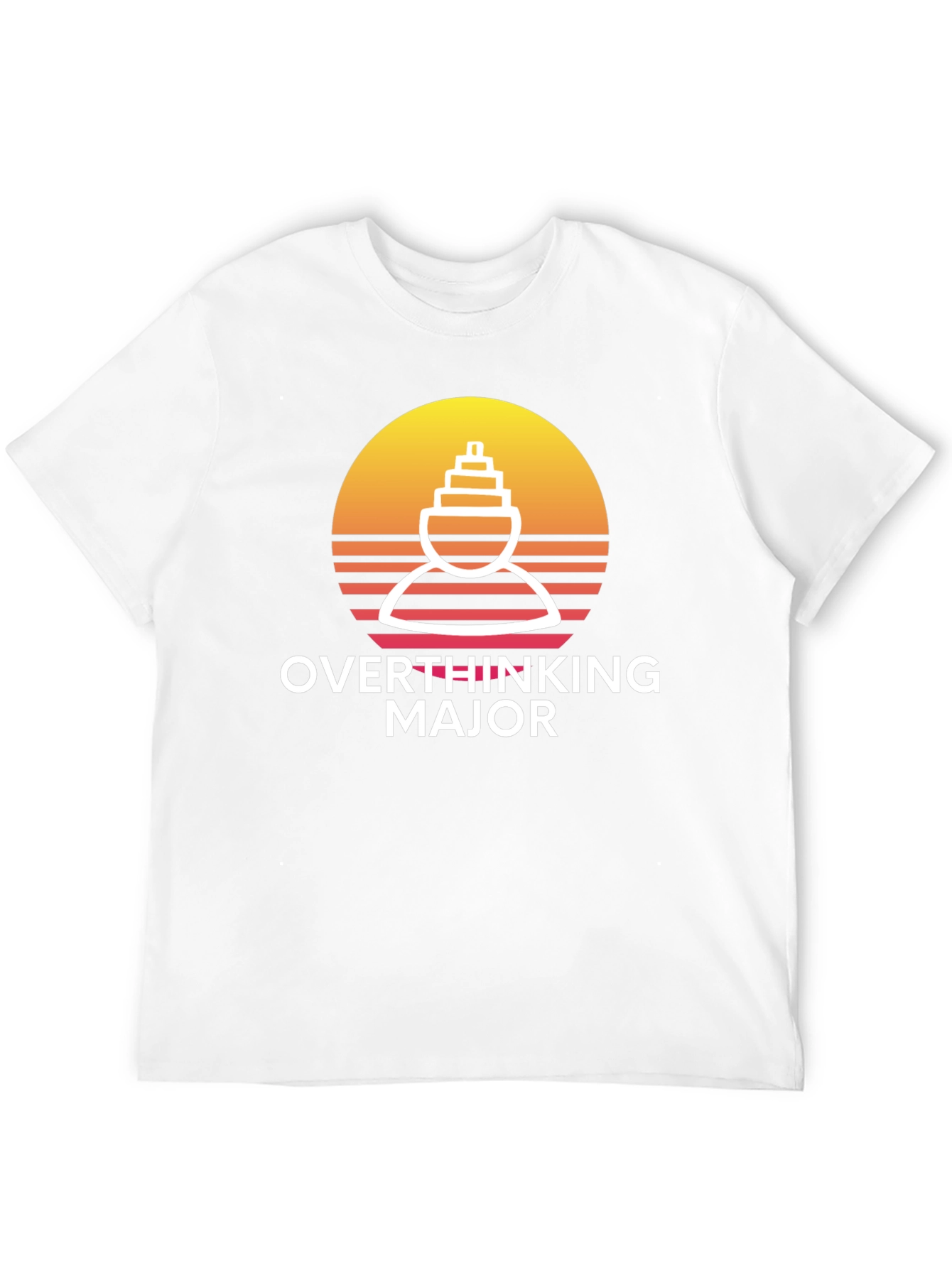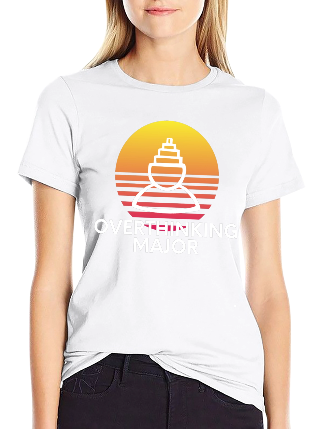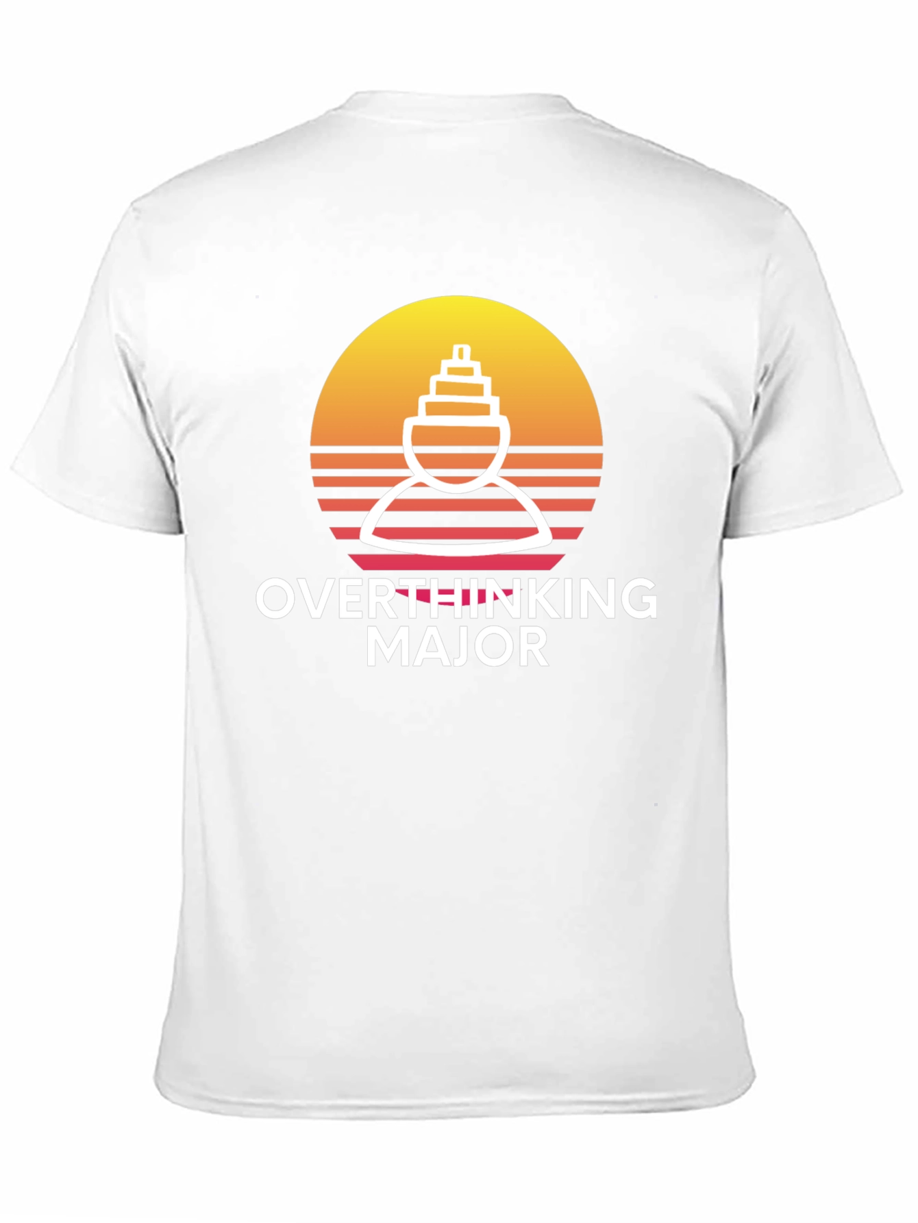 Esta elegante camiseta negra presenta un diseño llamativo y original. En el centro, destaca una imagen estilizada en forma de persona con capas ascendentes, enmarcada en un círculo degradado de amarillo a naranja, simulando un atardecer. Debajo, se lee la frase "OVERTHINKING MAJOR" en letras blancas mayúsculas. El diseño sugiere un concepto de reflexión profunda o complejidad mental, ideal para personas con un sentido del humor intelectual. Perfecta para uso diario, expresar tu personalidad única y provocar conversaciones interesantes.