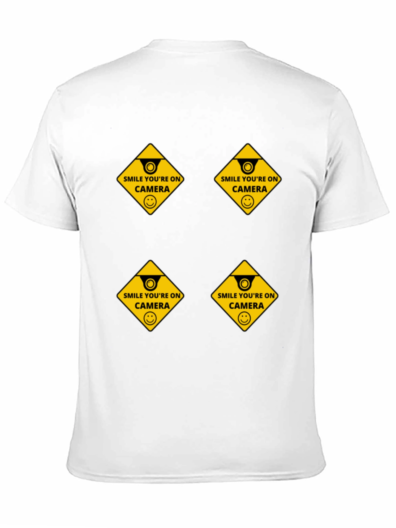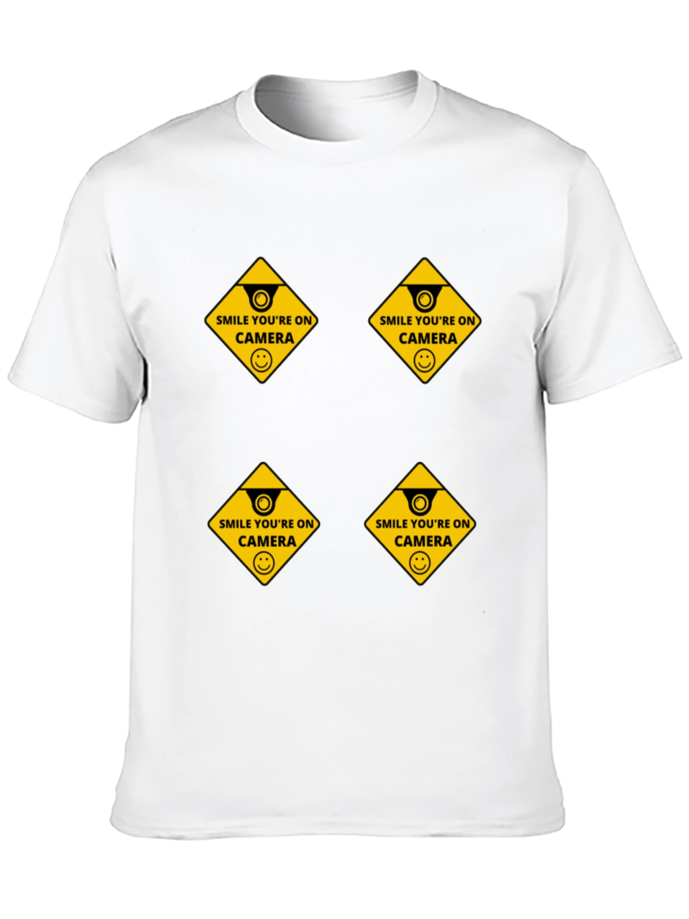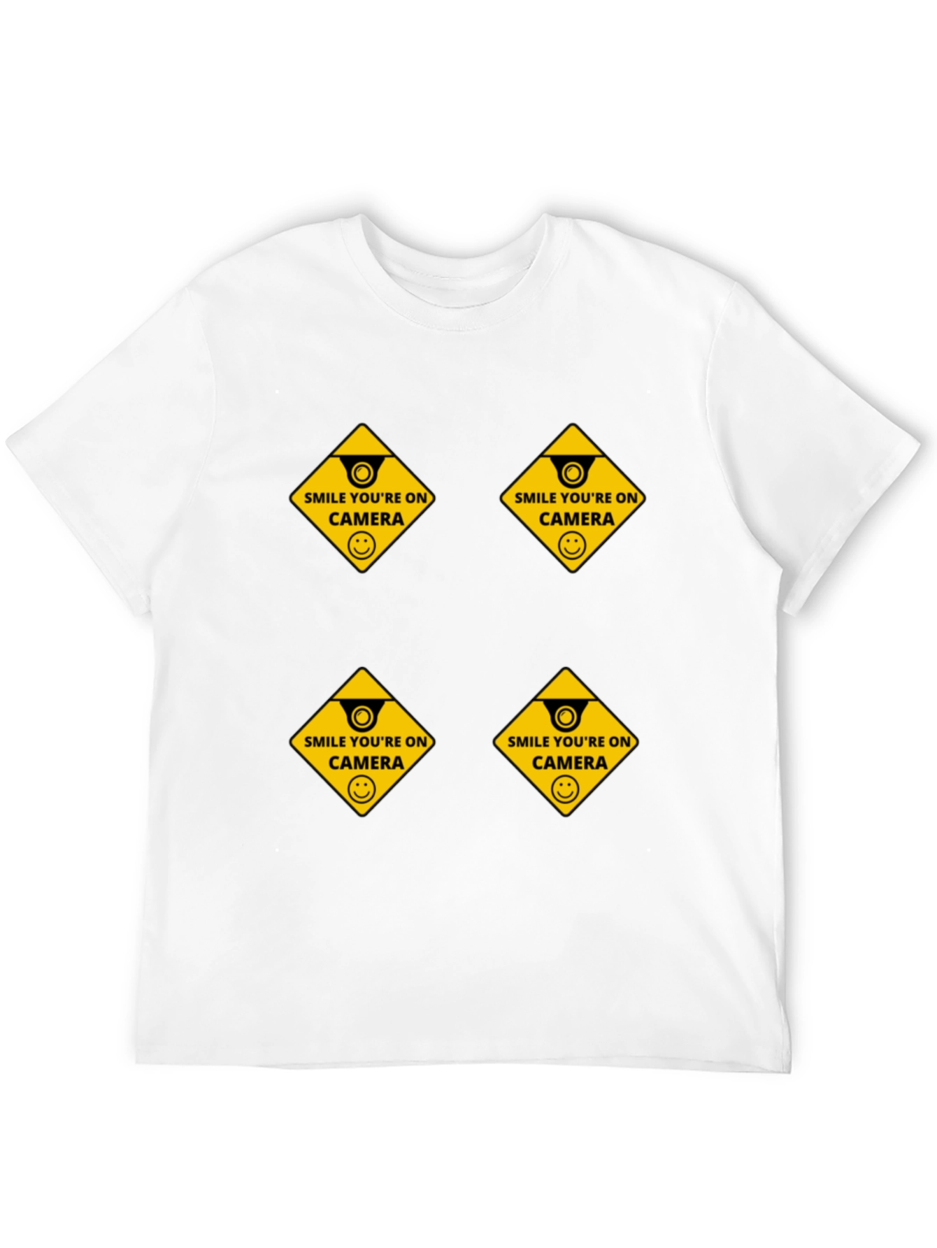 Muestra un poco de humor con esta llamativa camiseta negra. La camiseta presenta un diseño repetido de señales de advertencia amarillas con el mensaje 'Sonríe, Estás en Cámara', junto con un icono de cámara y una cara sonriente. El diseño crea un patrón único y divertido. Fabricada con una tela suave y confortable, esta camiseta es perfecta para uso casual y destaca entre la multitud. Ideal para llevar a fiestas, eventos o simplemente para añadir un toque de diversión a tu vestuario diario. Destaca entre la multitud con esta camiseta única y caprichosa.