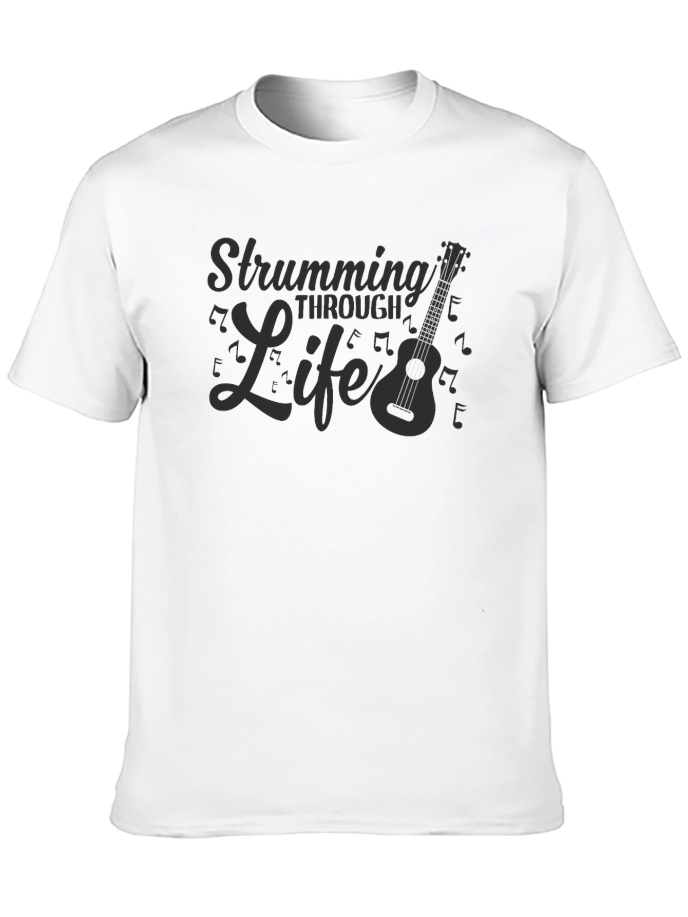 Disfruta de la vida con esta camiseta negra de manga corta, con un diseño único de "Strumming Through Life" junto a una ilustración de ukelele y notas musicales. Ideal para amantes de la música y el estilo casual. Perfecta para llevar en conciertos informales, reuniones con amigos o simplemente para expresar tu pasión por la música. Su color negro facilita combinarla con cualquier atuendo, desde jeans hasta pantalones cortos. Esta camiseta no solo es una prenda, sino una declaración de amor por la melodía de la vida. ¡Haz que cada día tenga su propia banda sonora!