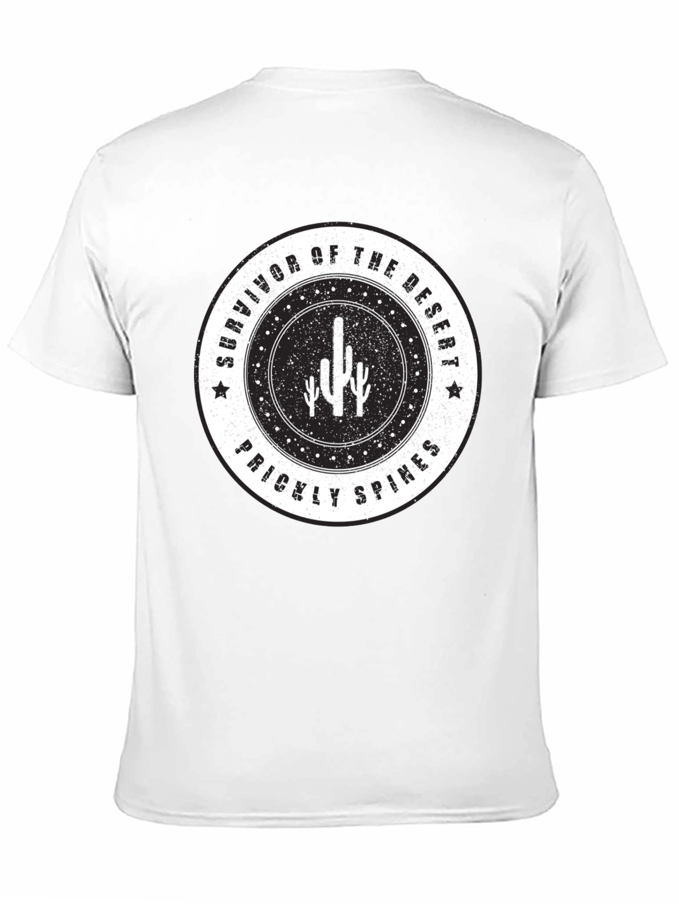 Luce un estilo único con esta camiseta negra de manga corta para hombre. Presenta un diseño llamativo con un estampado circular en blanco que destaca la frase "Survivor of the Desert - Prickly Spines", junto con un gráfico de cactus estilizados. Ideal para los amantes del desierto y la naturaleza, esta camiseta es perfecta para un look casual y relajado. Su tejido suave y cómodo asegura un ajuste perfecto para el día a día. Combina esta prenda con tus jeans o pantalones favoritos para un estilo auténtico y original. ¡Exprésate con esta pieza única en tu guardarropa!