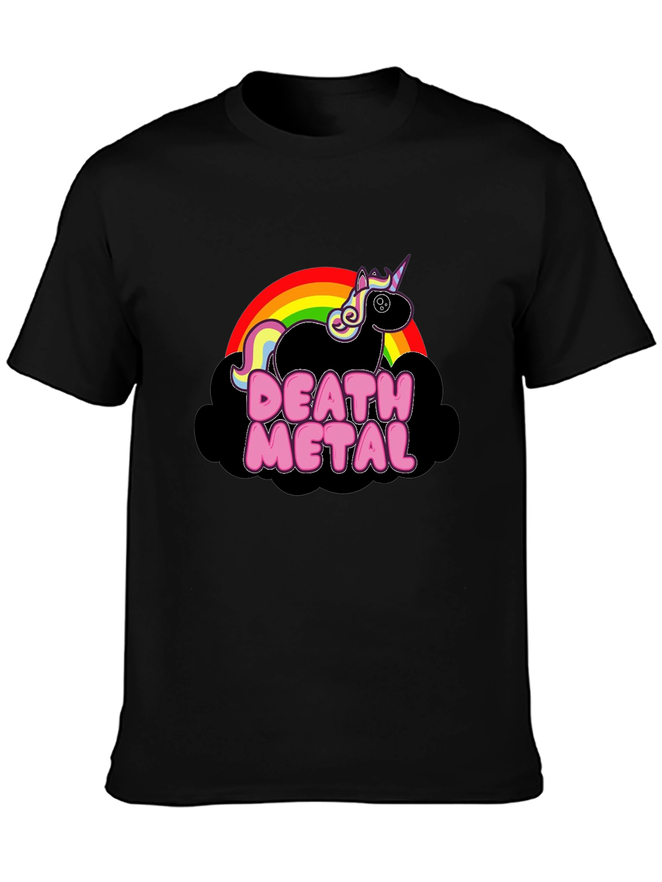 Muestra tu lado oscuro y divertido con esta camiseta negra única. Presenta un diseño llamativo de un unicornio negro con detalles coloridos, incluyendo una melena arcoíris y un cuerno brillante. La frase 'Death Metal' resalta con un estilo audaz y juvenil. Perfecta para los amantes de la música y el humor, esta camiseta es ideal para usar en conciertos, reuniones informales o simplemente para expresar tu personalidad. Fabricada con materiales suaves y cómodos, garantiza un ajuste perfecto y durabilidad. ¡Atrévete a destacar con esta prenda original y llena de actitud!