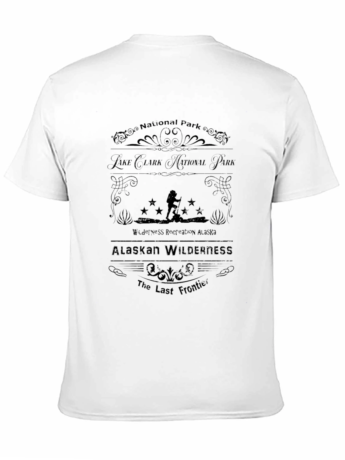 Luce esta camiseta negra con un diseño único del Parque Nacional Lago Clark. Ideal para los amantes de la naturaleza y las aventuras al aire libre. El diseño presenta un marco decorativo con la inscripción "Lake Clark National Park" y una silueta de un excursionista bajo estrellas, evocando la inmensidad de Alaska. Perfecta para senderismo, camping o simplemente para mostrar tu pasión por los paisajes vírgenes. Fabricada con materiales cómodos y duraderos, esta camiseta es una excelente adición a tu guardarropa casual y una forma de celebrar la belleza de la "Alaskan Wilderness, The Last Frontier".