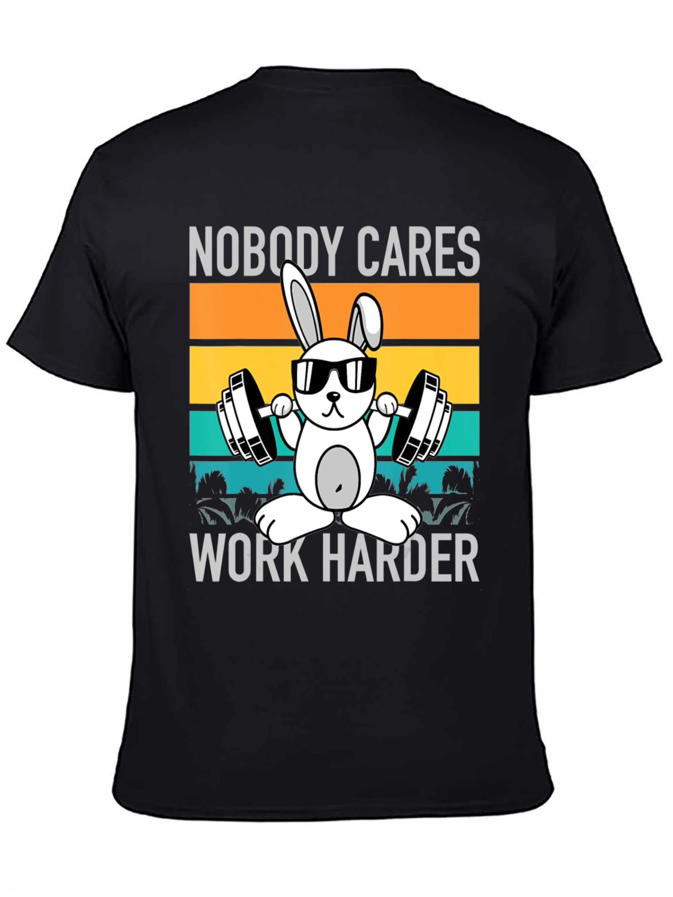 Luce esta llamativa camiseta negra con un diseño divertido y motivador. Presenta un conejo caricaturesco con gafas de sol levantando pesas, sobre un fondo de franjas horizontales en tonos naranja y turquesa. La frase "Nobody Cares Work Harder" añade un toque de humor y determinación. Perfecta para los amantes del gimnasio, atletas o cualquier persona que necesite un impulso extra en su día a día. Ideal para entrenar, salir con amigos o simplemente relajarte con estilo. Fabricada con materiales suaves y cómodos para un uso prolongado. ¡Muestra tu espíritu deportivo con esta original prenda!